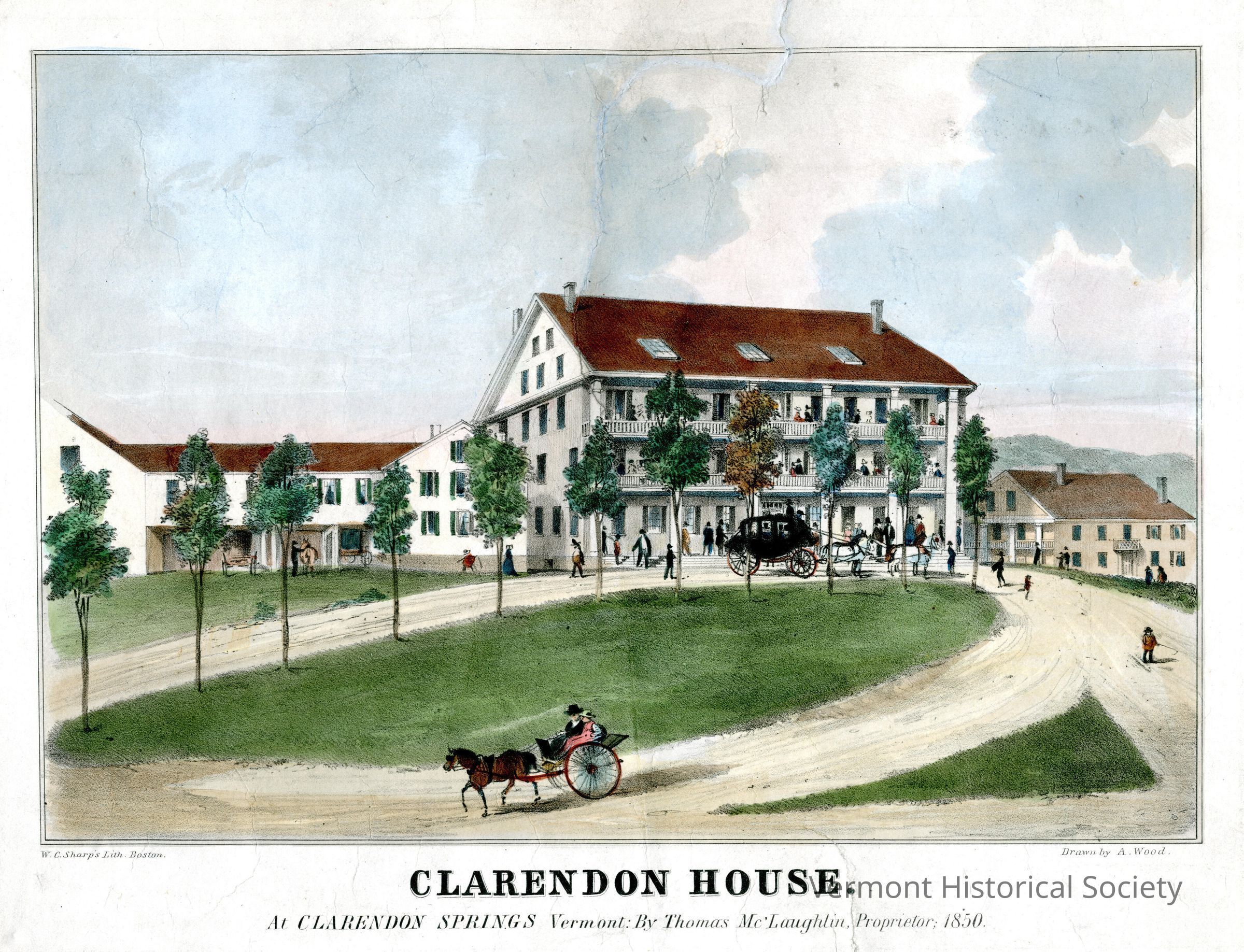 This artwork is a lithographic print that has been hand colored. It depicts a large white building with a red roof. In front of the building, there is a circular drive lined with young trees. On the portico of the building, several people can be seen, and there is a large carriage positioned in front of it. In the center foreground of the circular drive, there is a smaller open-top calash. Towards the right edge of the print, there is another building with a peach-colored exterior and a brown roof. Behind that building, mountains are visible. The sky above is lightly clouded. The bottom margin is labeled, "CLARENDON HOUSE. At CLARENDON SPRINGS Vermont by Thomas McLaughlin, Proprietor, 1850."Artwork Details