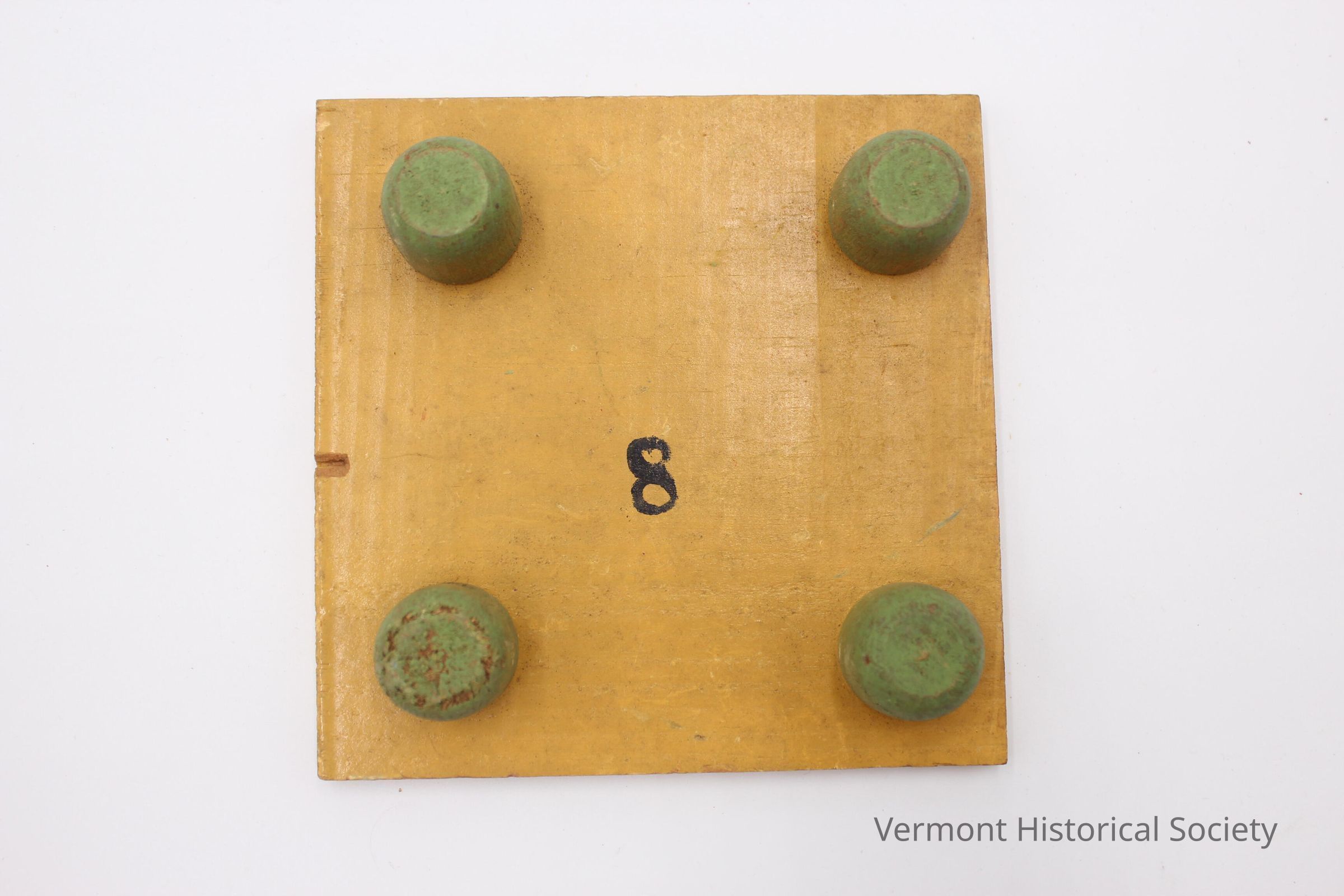 Putting hazard consisting of four wooden pegs inserted into the corners of a square wooden base. The pegs are painted green, and the base is painted yellow. The number 8 is painted in black at the center of the base.
