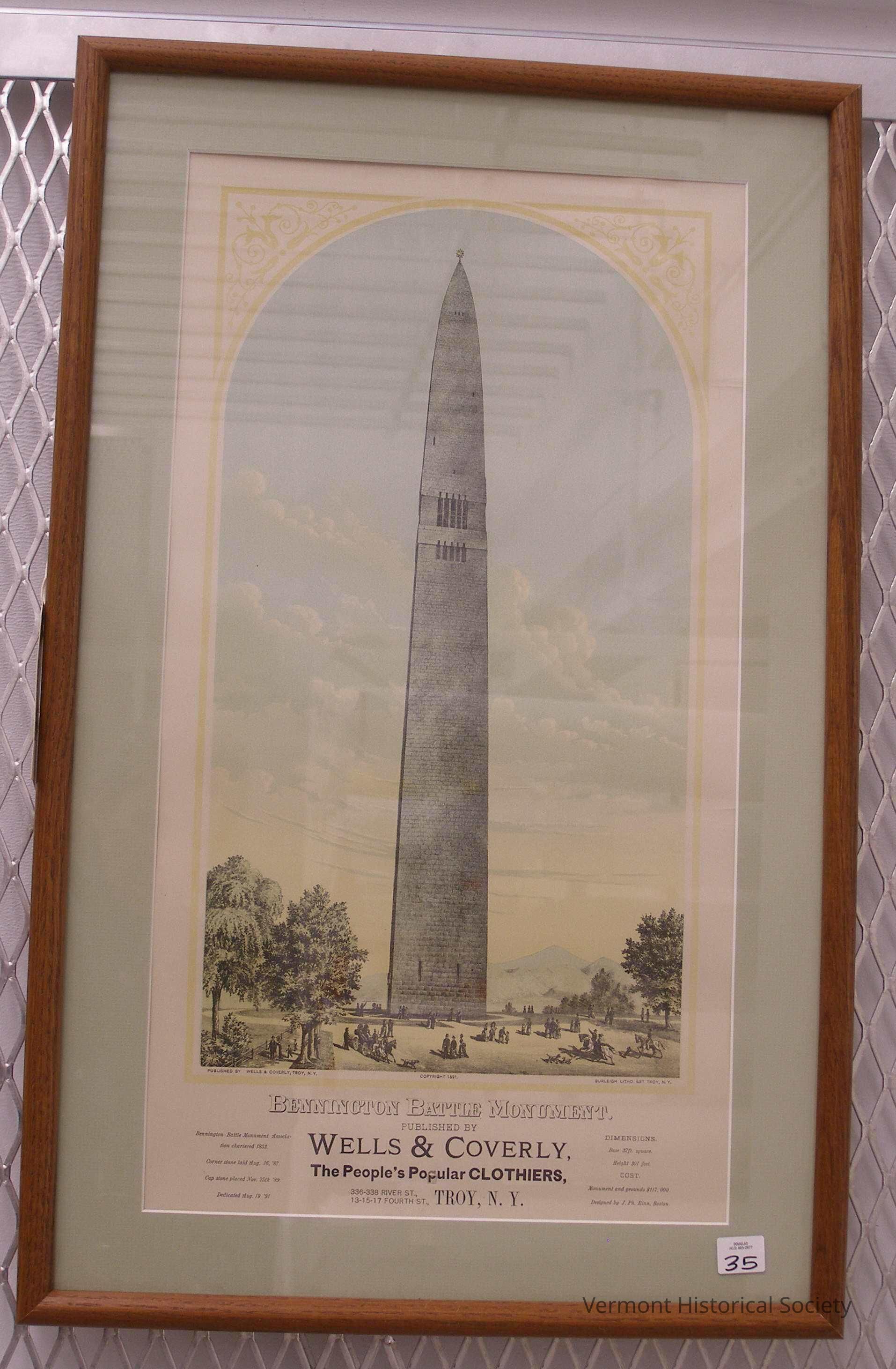 Under the print is the title, "BENNINGTON BATTLE MONUMENT" in empty serifed lettering delineated by stylistic, black outlining, an advertisement for a clothing store in Troy, New York, and details about the monument. Bearing inscriptions, "PUBLISHED BY," in small serifed lettering, "WELLS & COVERLY," in much larger, thin serifed lettering. Underneath in thick, dark, simplistic lettering, "The People's Popular CLOTHIERS," and below that in very thin and smaller, mono linear writing, "336-338 RIVER ST.,/13-15-17 FOURTH ST.," to the left in taller, darker, serifed lettering, "TROY, N.Y."