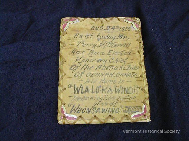 Plaque on a rectangular birch bark that reads, "AUG. 24th 1956 As at today Mr. Perry H. Merrill Has Been Elected Honorary Chief Of the Abenaki tribe of ODANAK, CANADA His Name Is "WLA-LO-KA-WINO" meaning Benefactor give By "WBONSAWINO" TROOP."