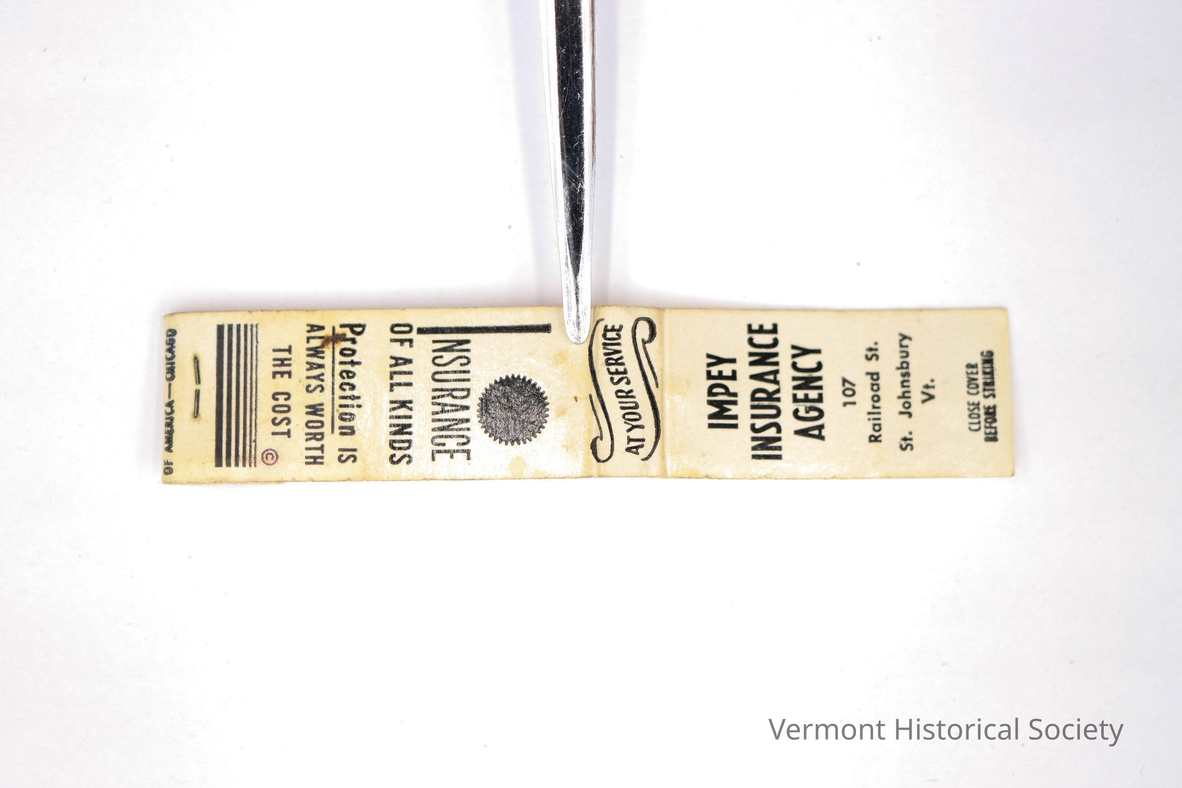 Narrow, white cardboard bifold matchbook. The front flap is printed with the inscription, "IMPEY INSURANCE AGENCY 107 Railroad St. St. Johnsbury Vt."