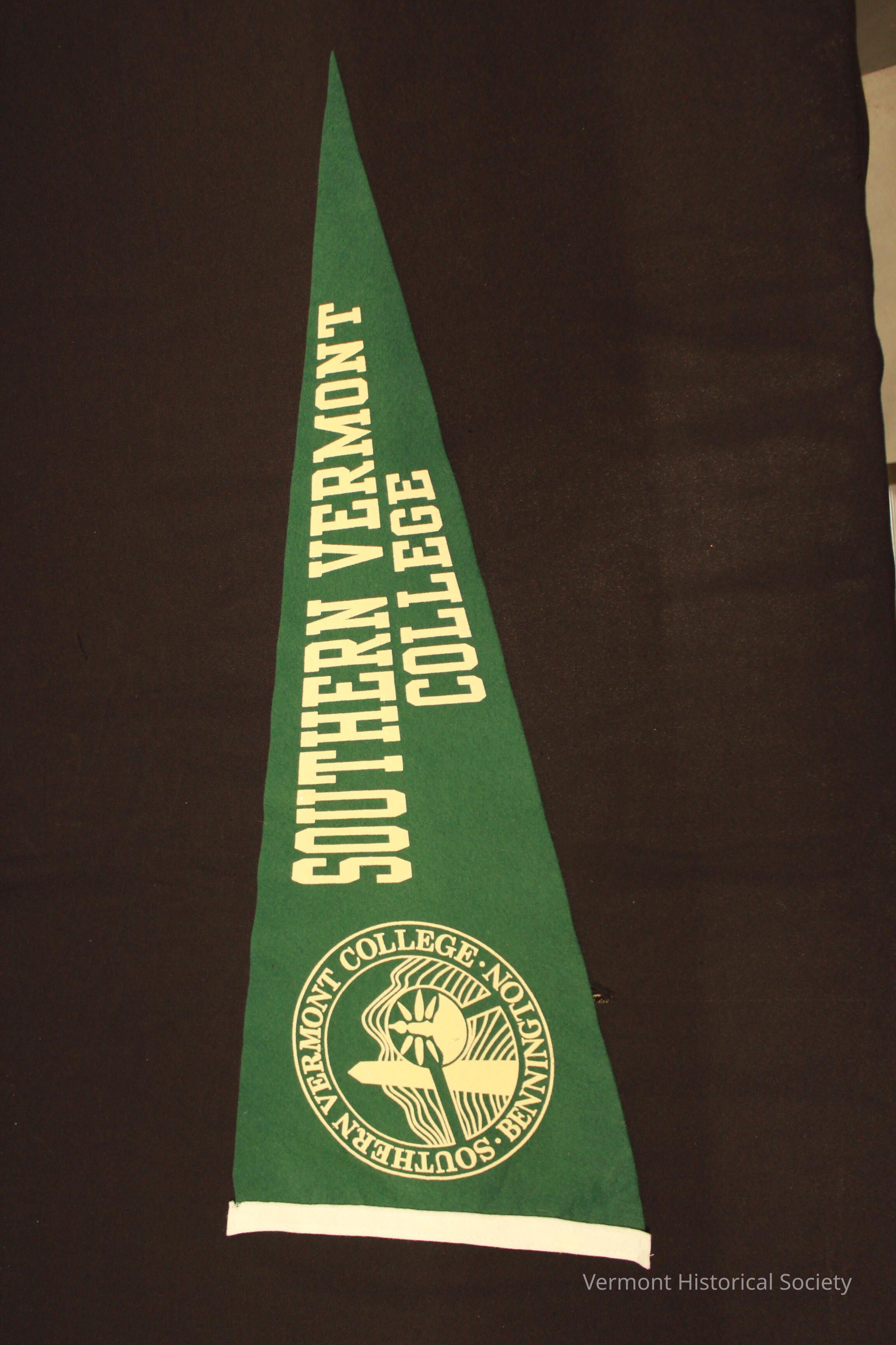 A green pennant from Southern Vermont College in Bennington, which closed in June 2019 due to financial insolvency. The banner, plus two others, came to the Vermont Historical Society along with the surviving historical records from the college and its predecessor, St. Jospeh Business School.