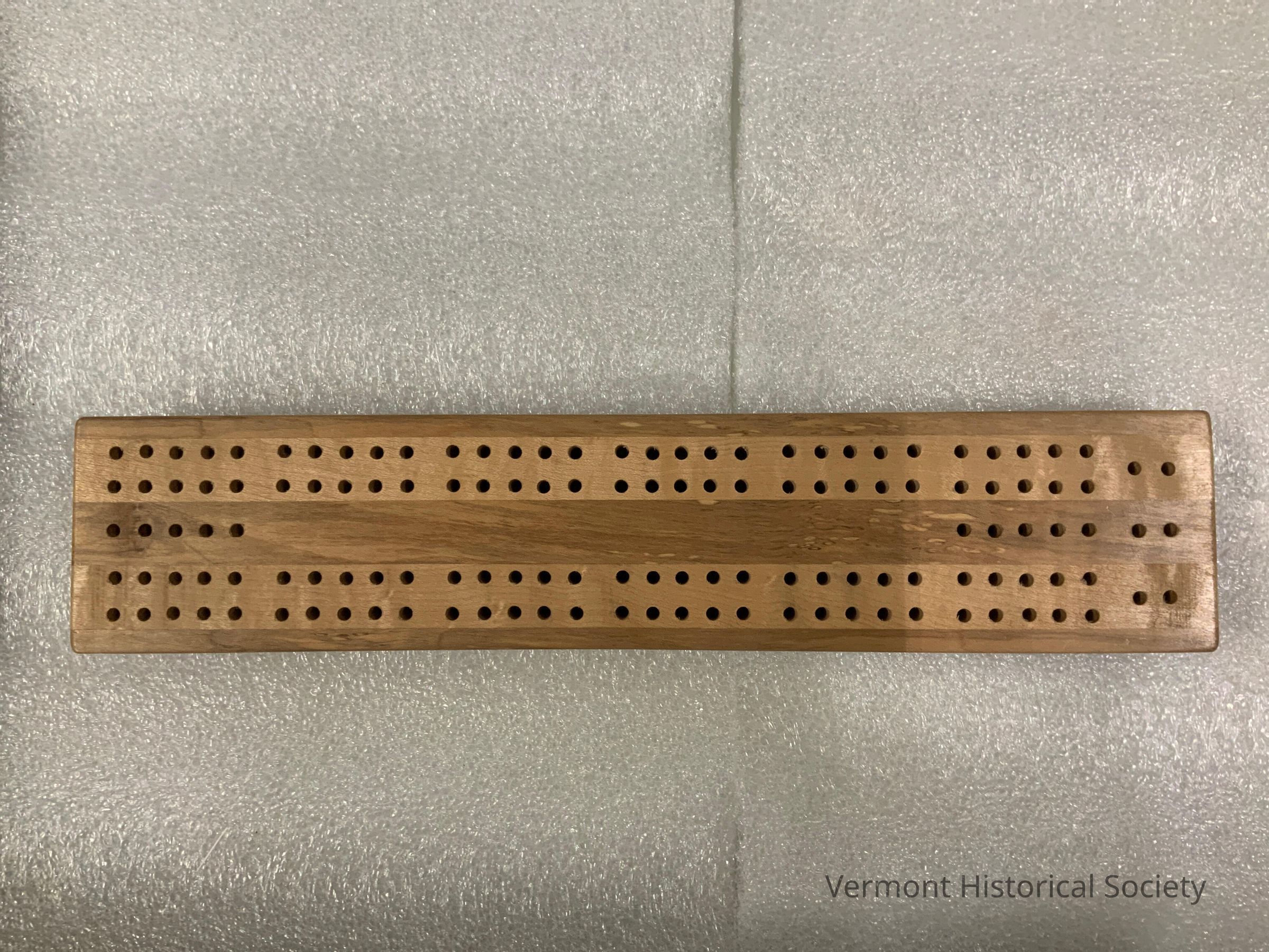 Rectangular wooden cribbage board. The board is formed from 5 strips of wood, alternating slightly in tone between dark and light (3 dark, 2 light). The 2 light strips are each drilled with 2 rows of 30 holes followed by a single row of 2 holes. The center strip is drilled with a single line of 5 holes on one end and 7 holes on the other end. The reverse has a U-shaped compartment carved into the center strip at one end that closes by inserting a metal plate. Inside, there are several red and unpainted game markers. The words, "JOHN'S TINKER SHOP MARSHFIELD, VERMOTN 05658", are burned into the wood above the compartment. Below the compartment is a round, white sticker with the written inscription, "$11.00".Use