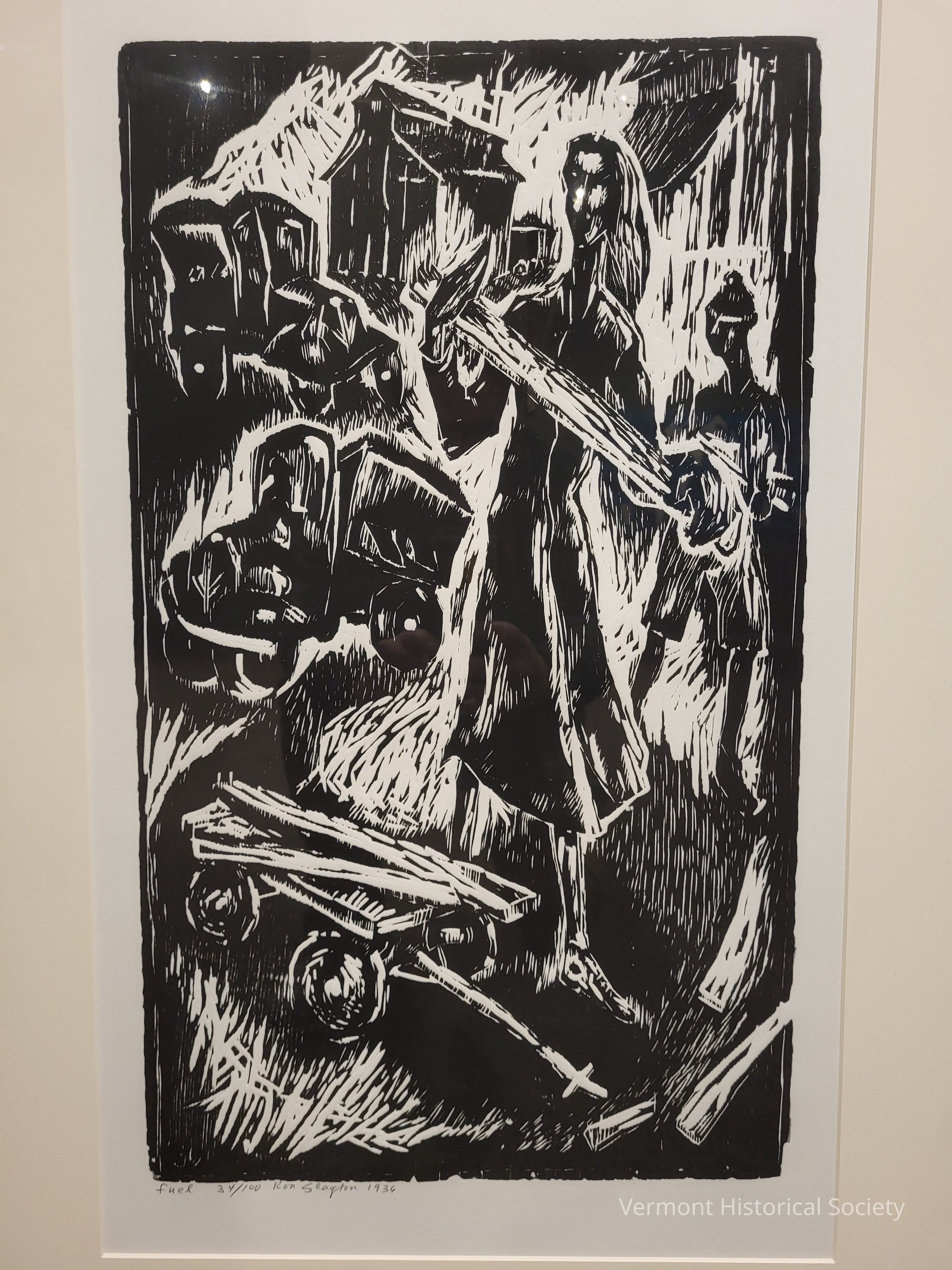 This particular woodcut was created during his first year working for the Federal Art Project as an easel artist. This print was exhibited in a 1989 exhibition of his work at the T.W. Wood Gallery in Montpelier. To accompany the work, Slayton offered the following poem: