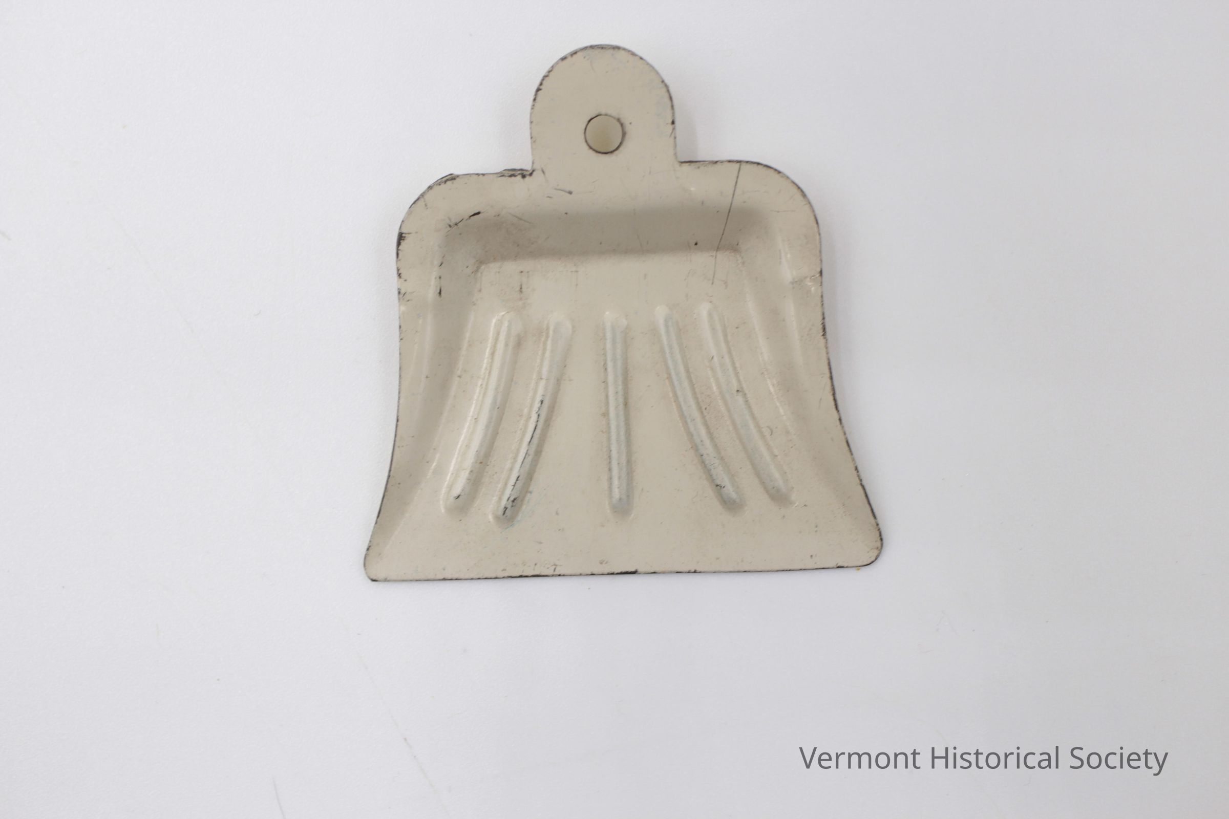 Miniature white-enameled metal dustpan sized for a dollhouse.Context