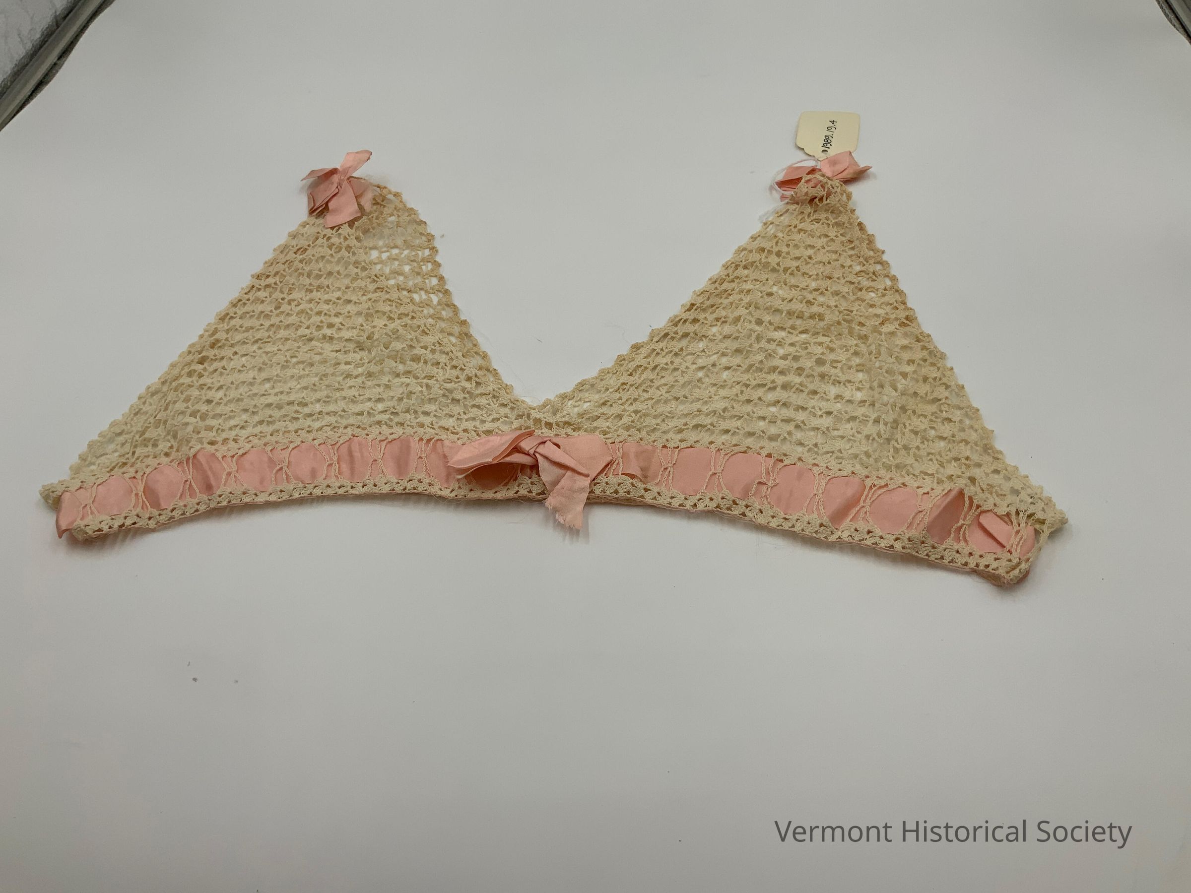 Bust portion of a camisole. It consists of 4 triangles--2 in the front and 2 in the back--attached along the bottom edge. The bottom edge is decorated with a wide pink ribbon threaded through the lace and tied into a bow at the center front. The tops of the triangles are attached with pink bows, forming should straps.
