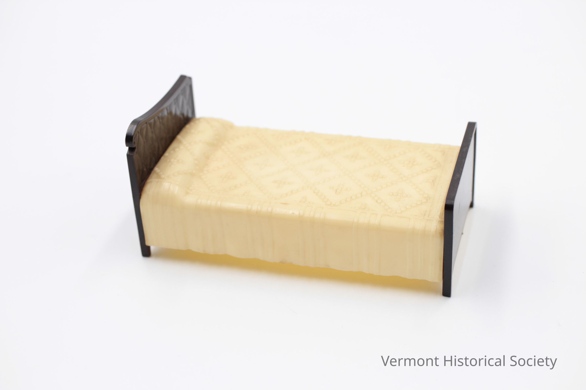 Miniature plastic bed sized for a dollhouse. The bed has a foot and head molded from marbleized brown plastic in an open-carved design. The bed surface is molded to look like it's covered with a cream-colored quilt, rolled over a pillow at the head.Context