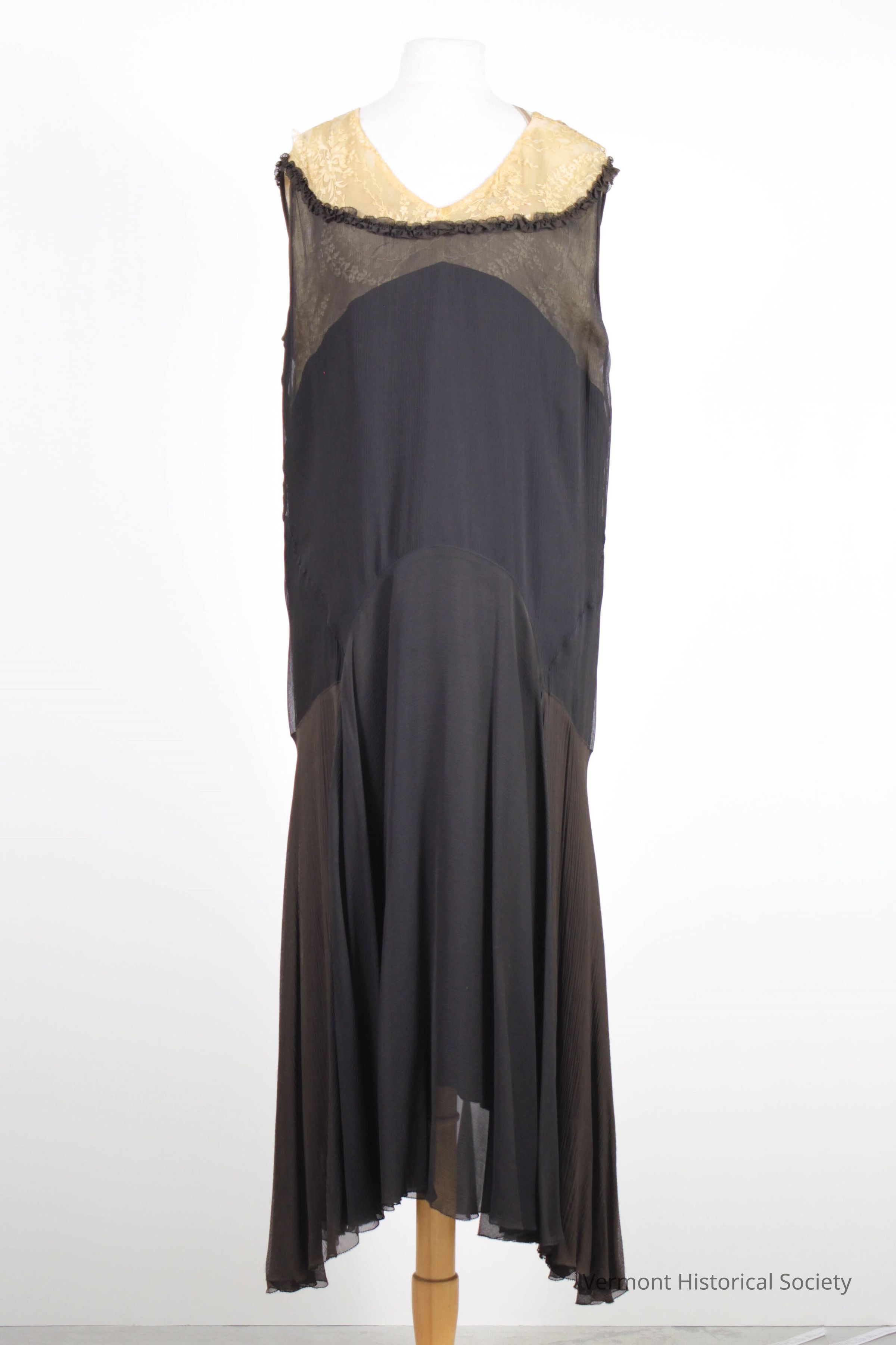 Sheer black silk crepe dress with no sleeves. The bodice portion of the dress is made in two layers: The inner layer has ivory lace at the yoke and black fabric for the rest of the bodice. The black attaches to the yoke in an upside-down U shape. The outer layer attaches over the lace at the arm openings and curves down to the bottom of the neckline at the center front. The seam is accented with gathered sheer black fabric. The waistline is dropped and shaped into a upside-down U. The center front is just below the natural waist and the sides are below the hip. The waist seam shape gives the bottom hem a sloping "handkerchief" line.
