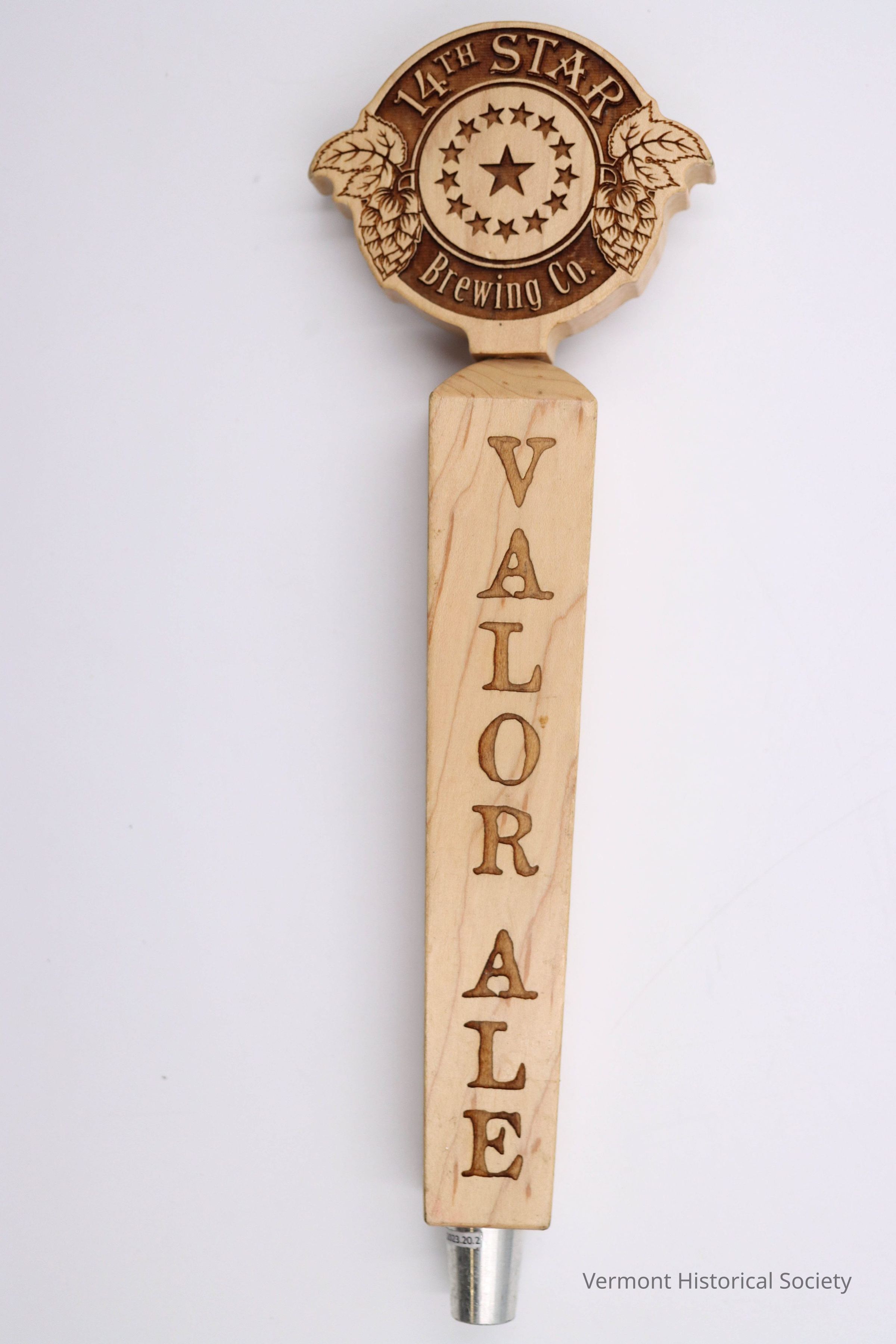 Wooden beer tap. There is a rotatable wooden disk at the top that is laser etched with a logo consisting of central stars, 2 hops cones, and the words, "14TH STAR Brewing Col." The shaft of the tap is etched with the label "VALOR ALE". There is a metal socket at the base for attachment.Context