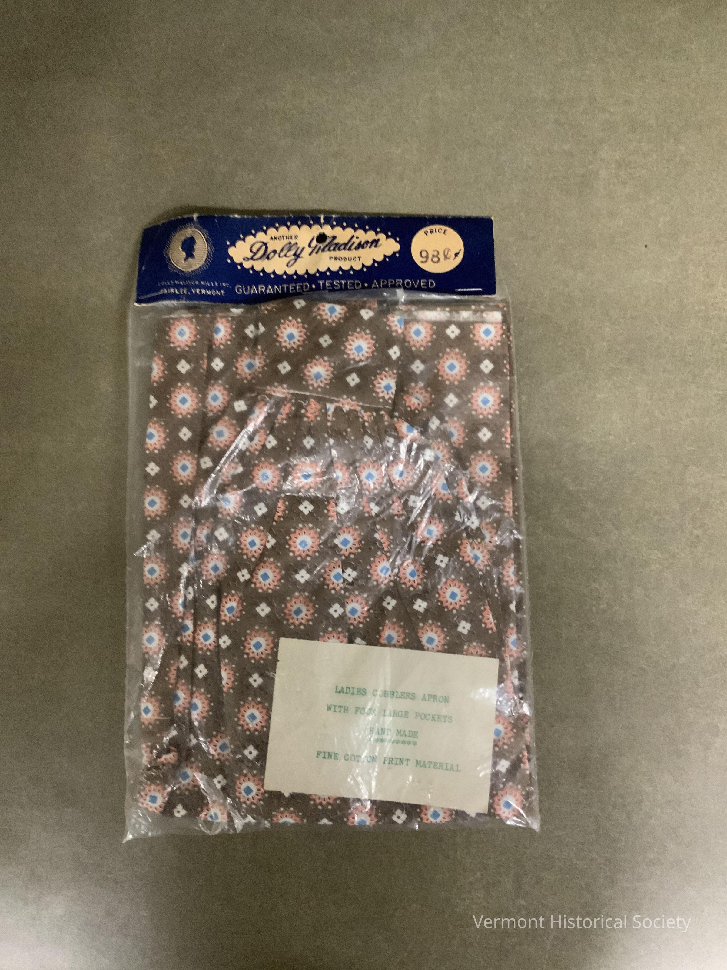 Cotton apron in original retail packaging. The fabric of the apron is printed with a brown ground and red, white, and blue rosettes. It is in a clear plastic bag with a cardboard label stapled to the top. The label has an oval logo that reads, "GENUINE Dolly Madison PRODUCT". A paper card within the package reads, "Ladies Cobblers Apron with Four Large Pockets Hand Made Fine Cotton Print Material".Context