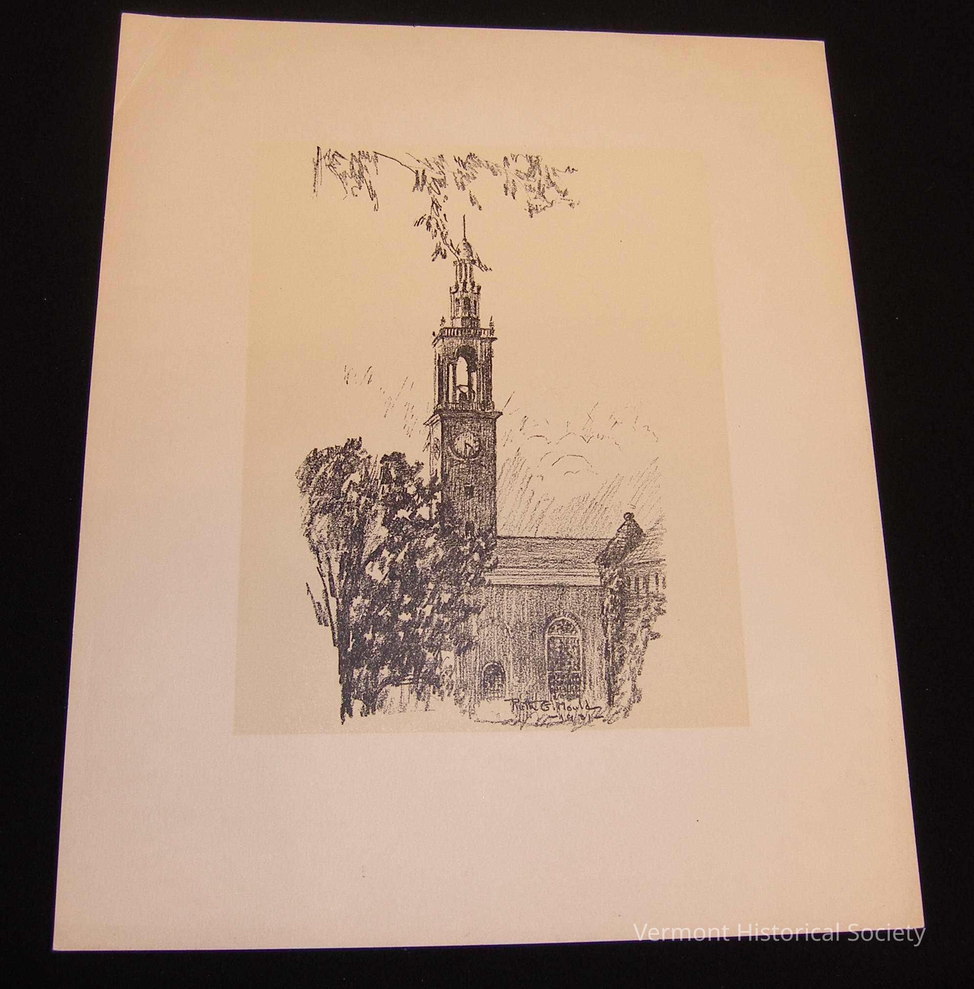 Print showing a chapel building in a sketch style. The building has a tall front steeple and bell tower with a clock face. There is an arched window on the side of the building facing the viewer. The chapel's entrance is obscured by a tree.