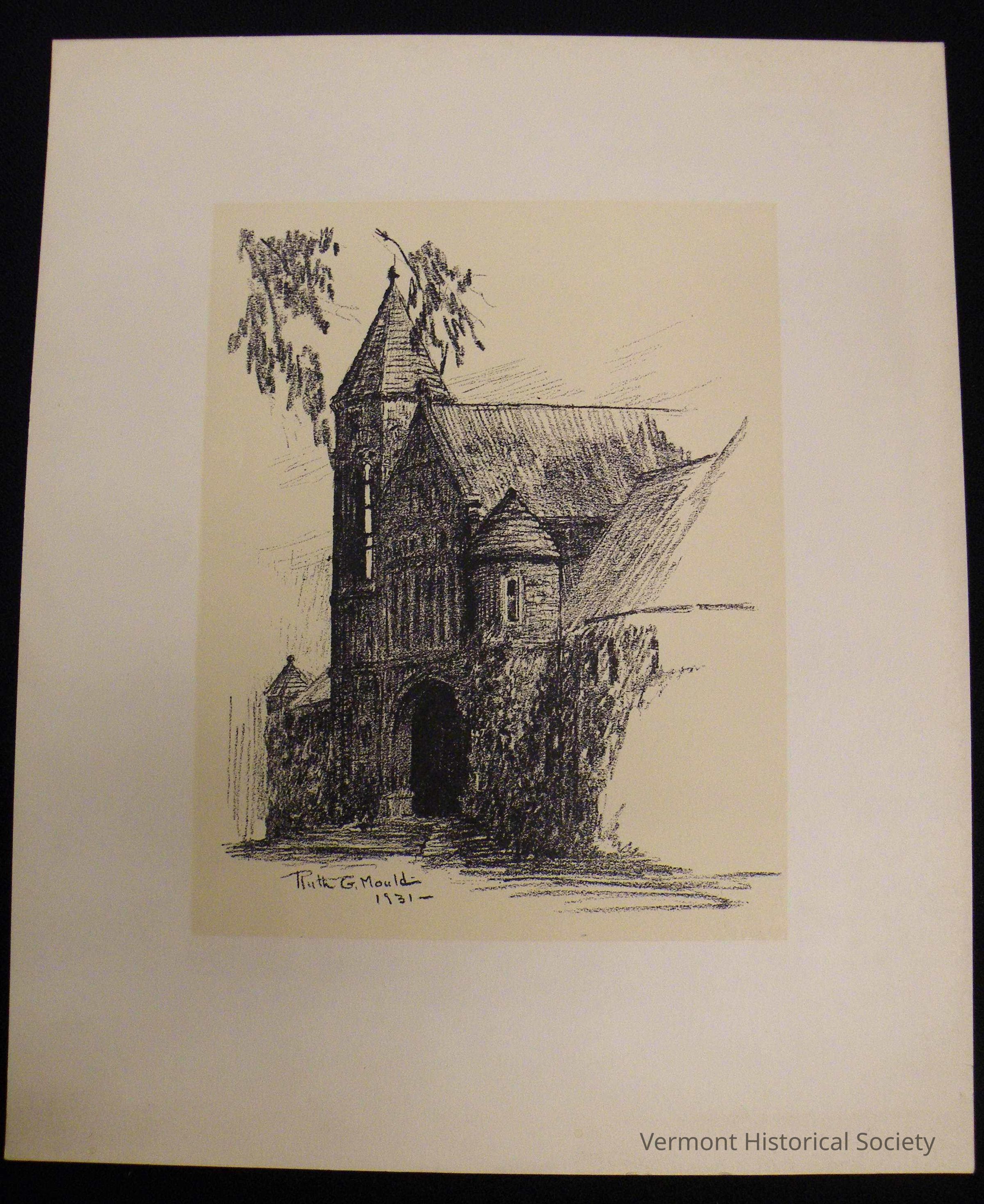 Print showing a large, Gothic revival building in a sketch style. The building has two side towers with a pointed roofs and a central arced entryway. The bottom left is signed, "Ruth G. Mould 1931".
