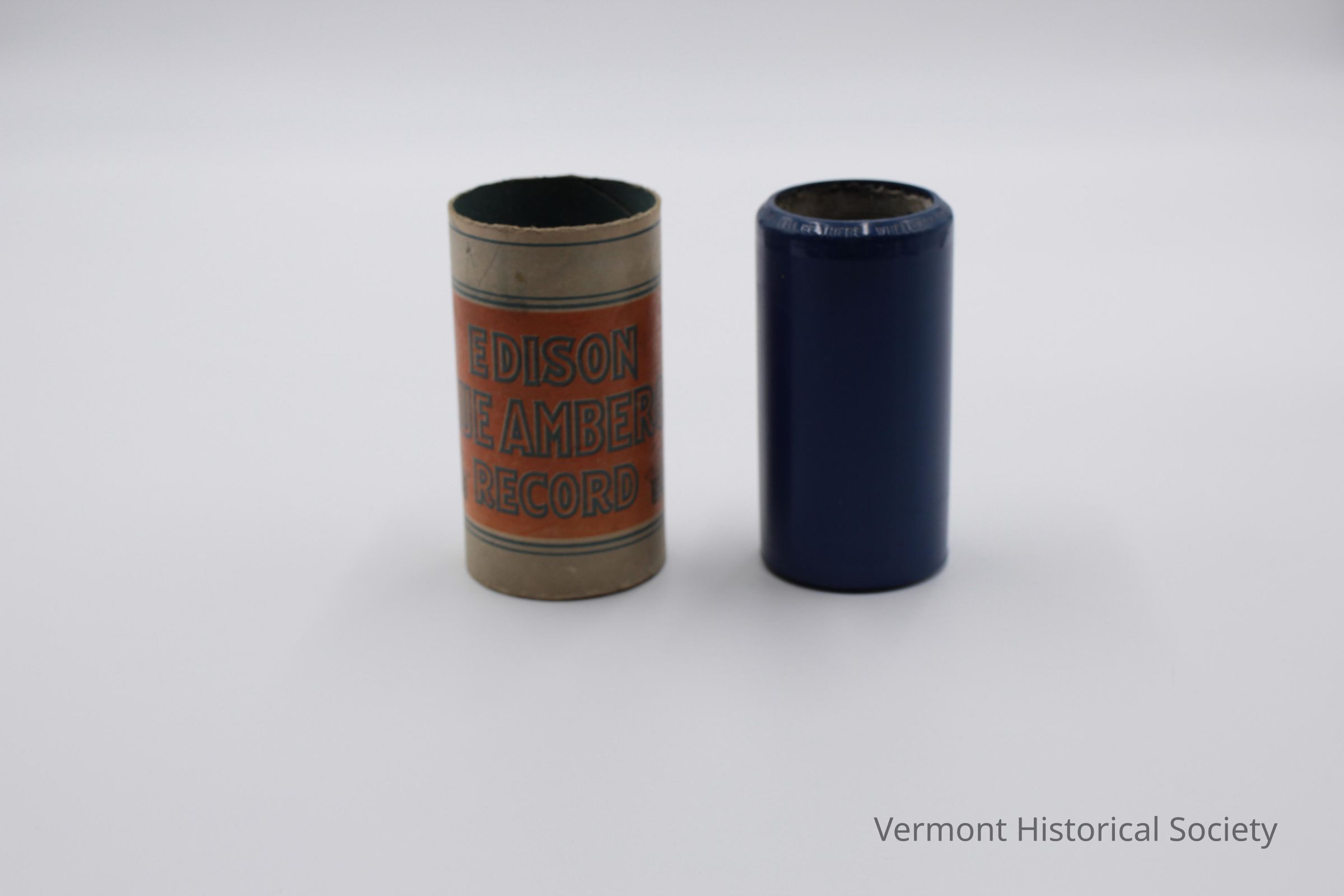 The cylinder is accompanied by a cardboard case. The case is labeled on one side with the words, "EDISON BLUE AMBEROL RECORD", in blue on an orange ground. The other side is printed with a photographic portrait of Thomas Edison above the patent and trademark information and the price (60 cents)Use