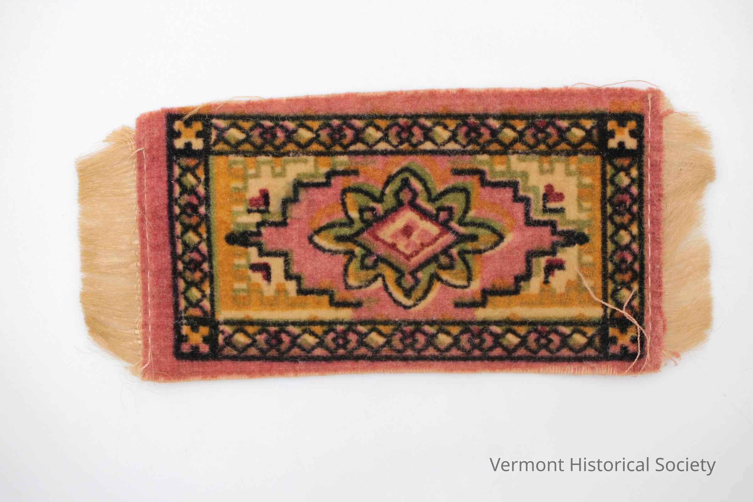 Miniature rug sized for a dollhouse. The rug is printed with an eastern-inspired design in pink, yellow, green, and black with a central medallion. There is cream fringe stitched to each short edge of the rug.Context