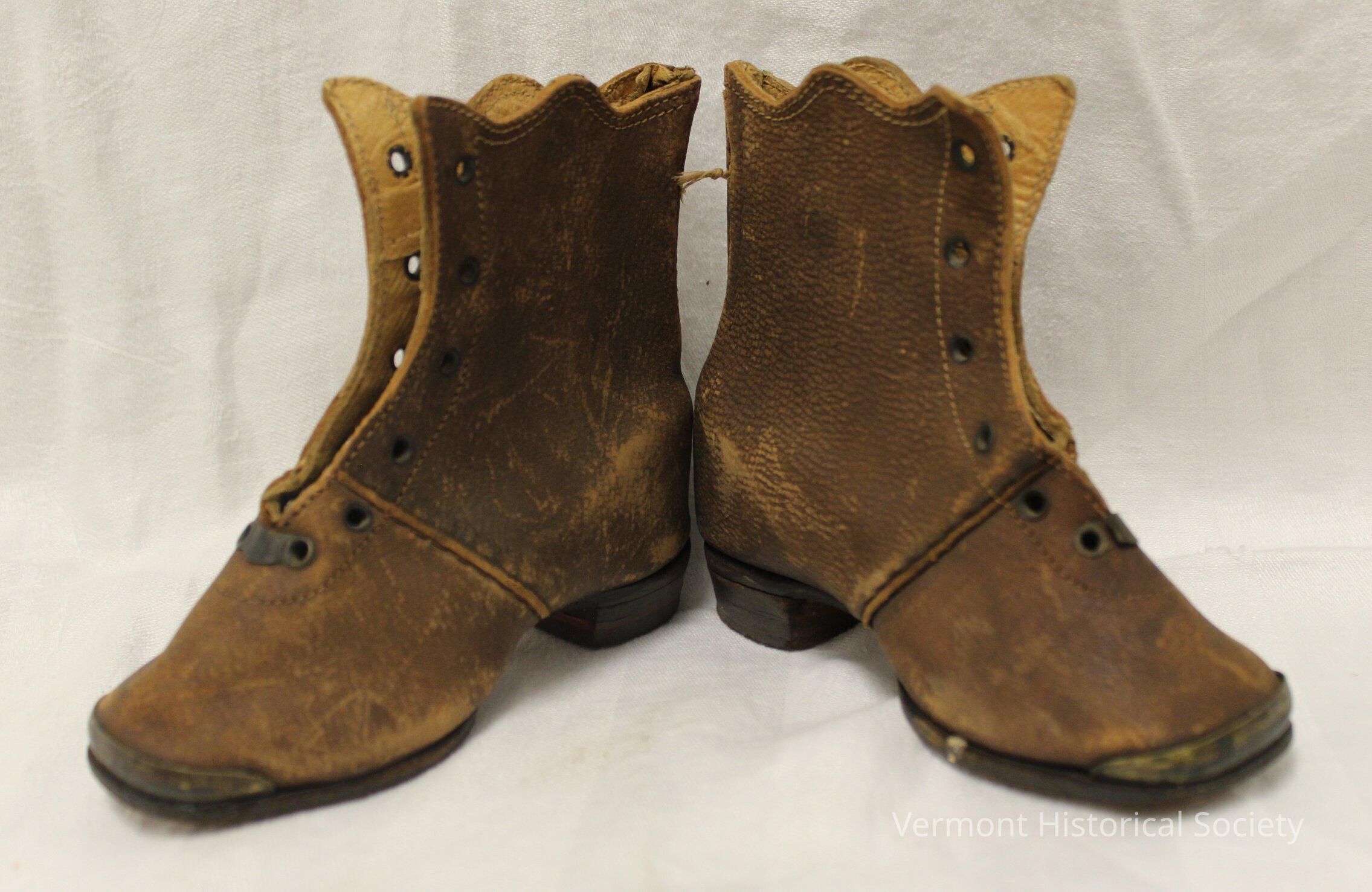 Sales sample boots. The top edge is scalloped. It opens at the center front with metal eyelets for tying. The sole is thick leather with a stacked leather heel. The number 5 is stamped into the sole near the toe. There is a metal guard across the front of the toe box, and a small metal band stretches between the 2 lowest eyelets. The initials "PA" are stamped into the metal band on the right shoe. The nails attaching the heel extend into the interior of the shoe.