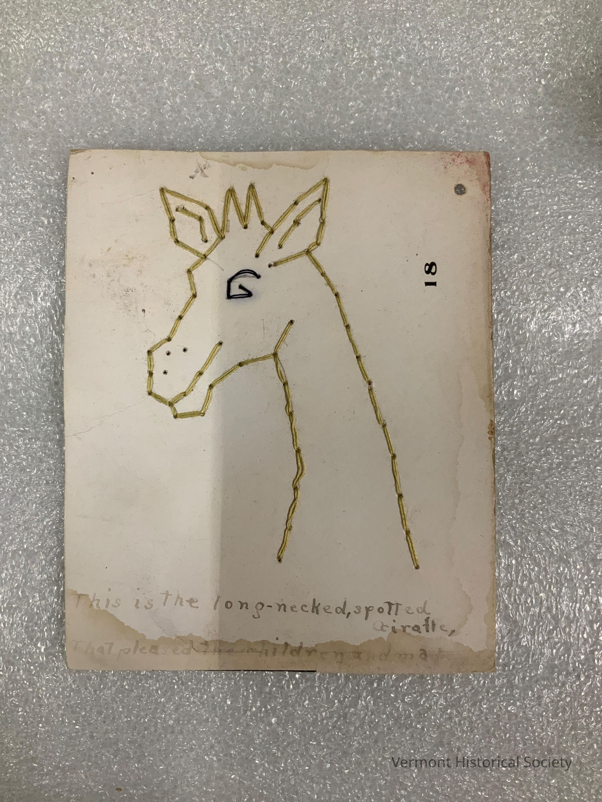 Rectangular cardboard sewing card with holes punched through it forming the outline of a giraffe's neck and head. The holes are stitched with yellow and black embroidery thread. The inked inscription, "This is the long-necked, spotted Giraffe, That pleased the children and mad [illeg]" is inked along the bottom edge.Context