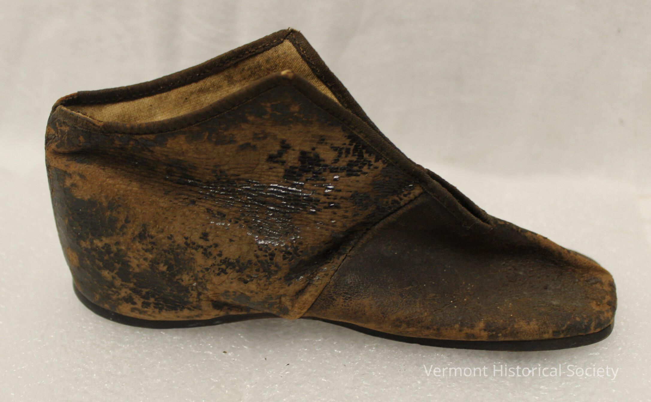 Single early shoe sized for a child. There are no fasteners, but there are two small holes at the base of the bound opening slit that may have had a tie. The sole is the same thickness throughout with no added heel. The inside is lined with a cream colored fabric.
