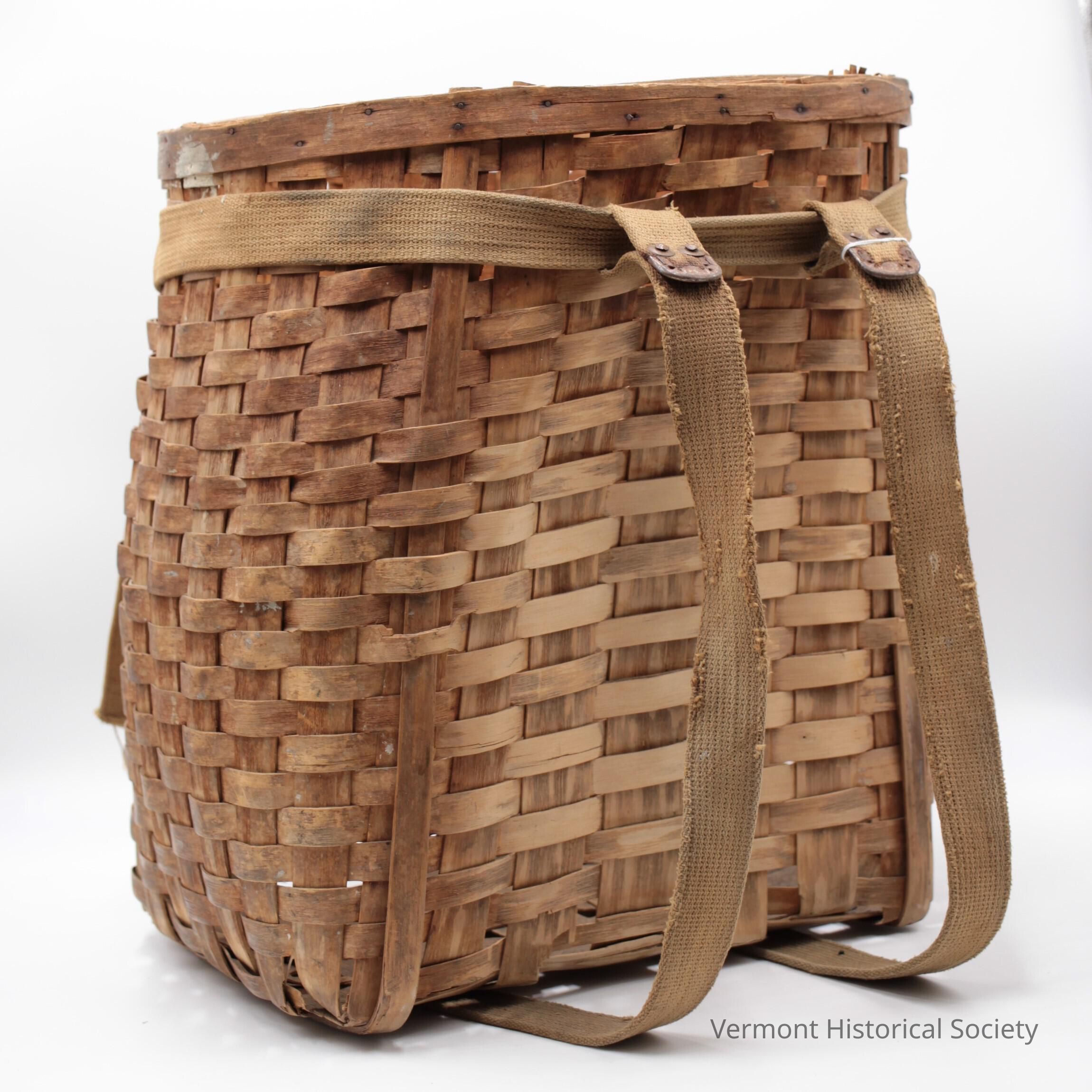 Large basket with webbing straps for carrying on a person's back. The basket is a rounded rectangle shape with one side concave. Khaki webbing is wrapped around the top of the basket and hung with two long straps that stretch from front to back around the bottom of the pack in order to be worn over a person's shoulders, like a backpack. The straps are adjustable at the front of the pack via metal buckles.