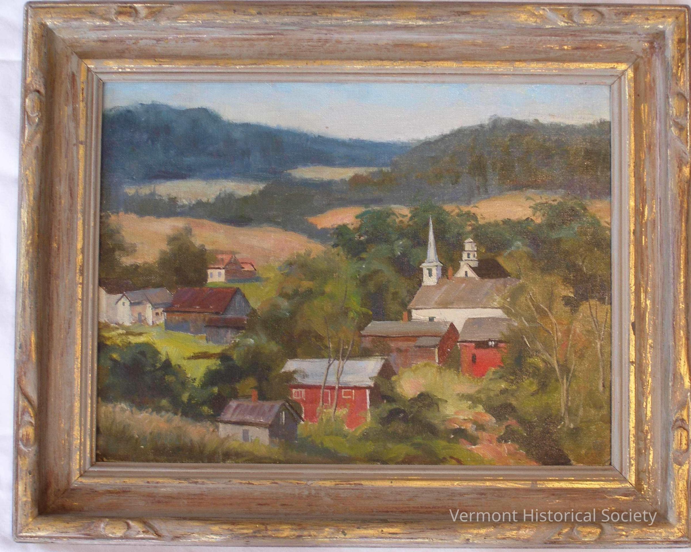 Landscape painting showing a town nestled amid rolling hills and mountains. The town consists of a white church with pointed steeple, a white municipal building with a cupola behind, and several red and white building before. The hills in the foreground are green with tall, thin trees. The hills in the middle ground are golden, indicating agricultural use, and the hills/mountains in the background are dark.Type of Painting