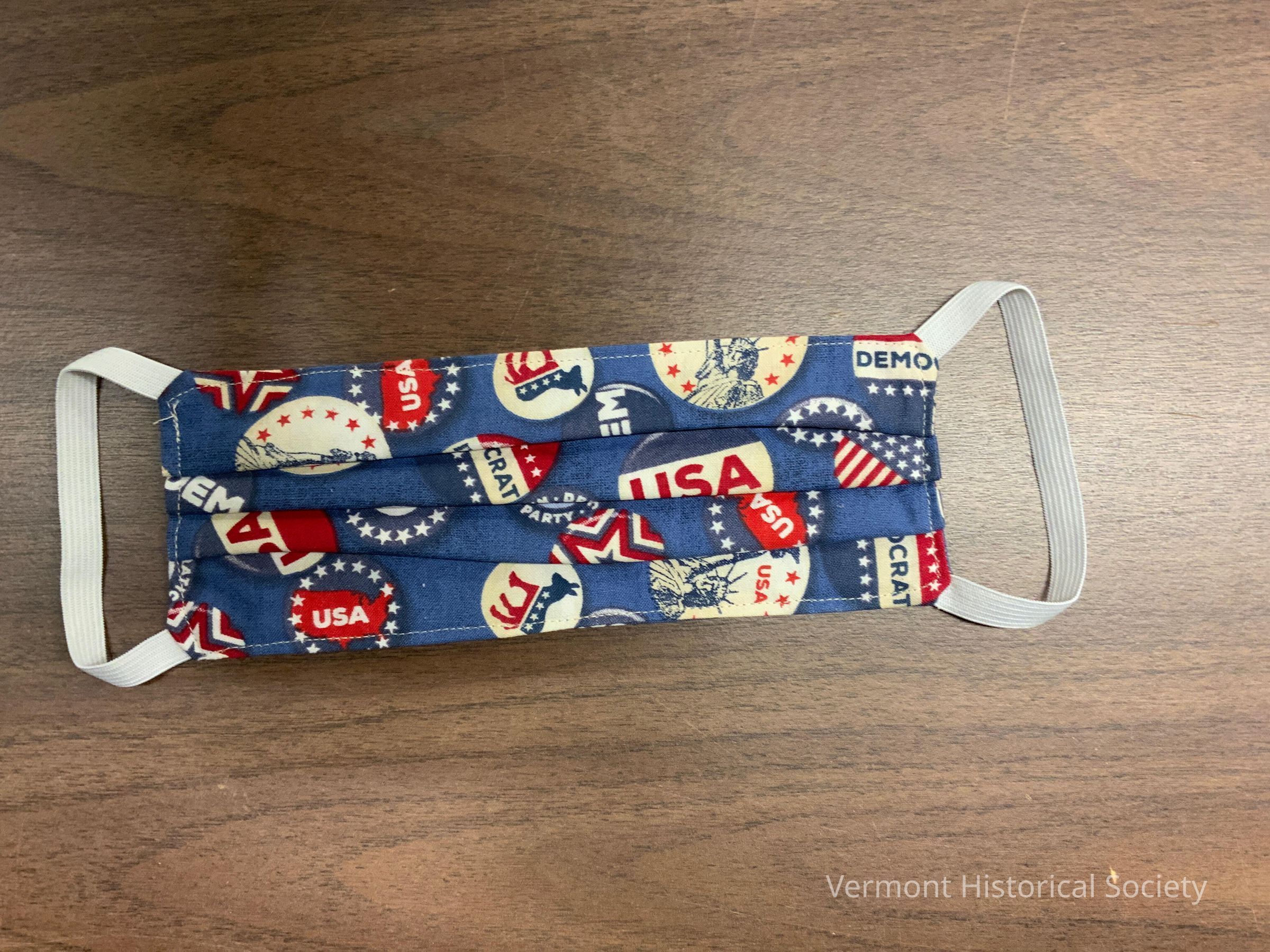 Pleated cotton face mask with an all-over printed design of political buttons on a blue ground. There are elastic ear loops on either end of the mask. The buttons show the Statue of Liberty, the Democratic Party donkey logo, flags, "USA", and "DEMOCRAT".Context