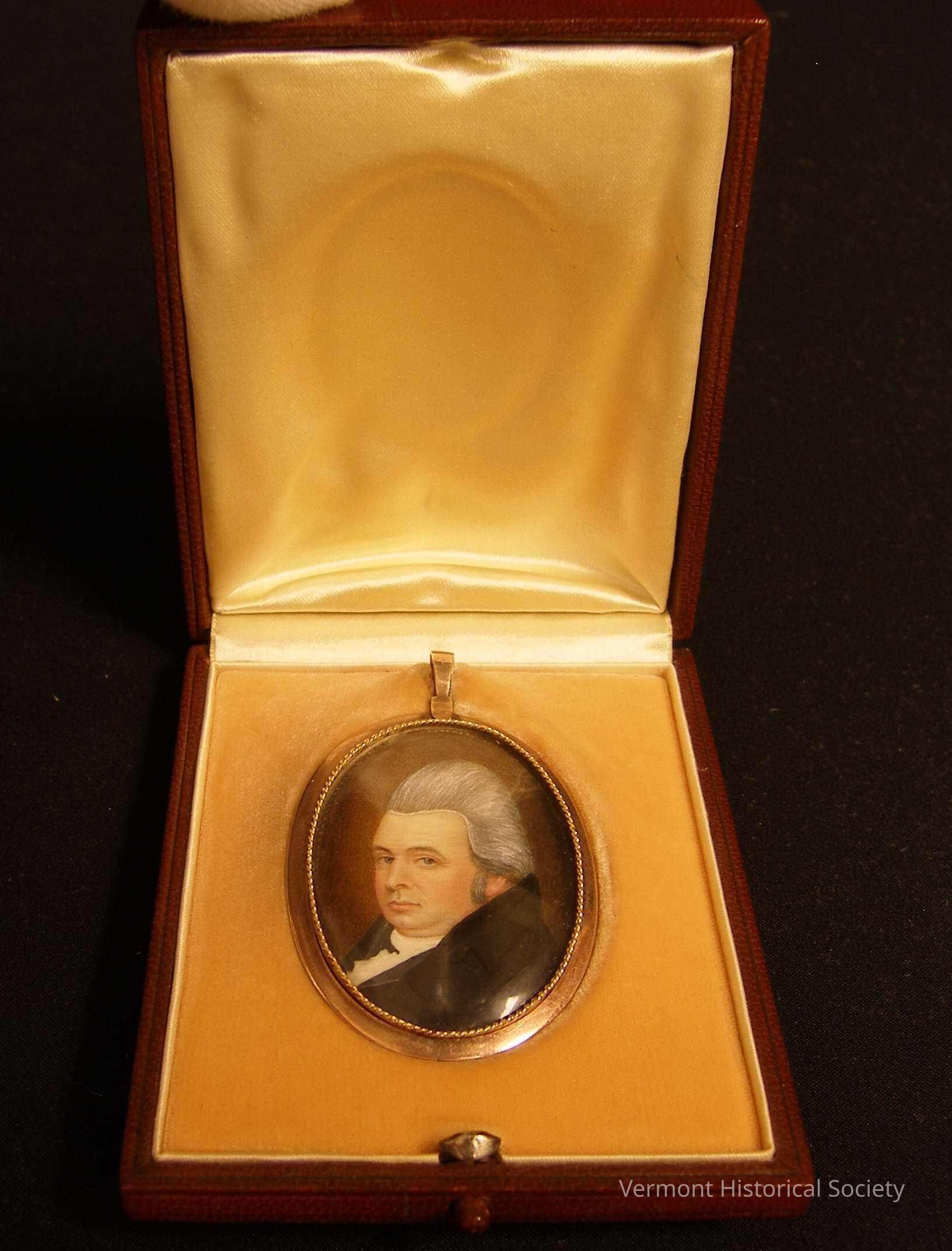 Oval miniature in gold frame. Domed glass front and back. Portrait of Royall Tyler wearing a high collared black coat and powdered wig with hair pulled back. Long silver sideburns.