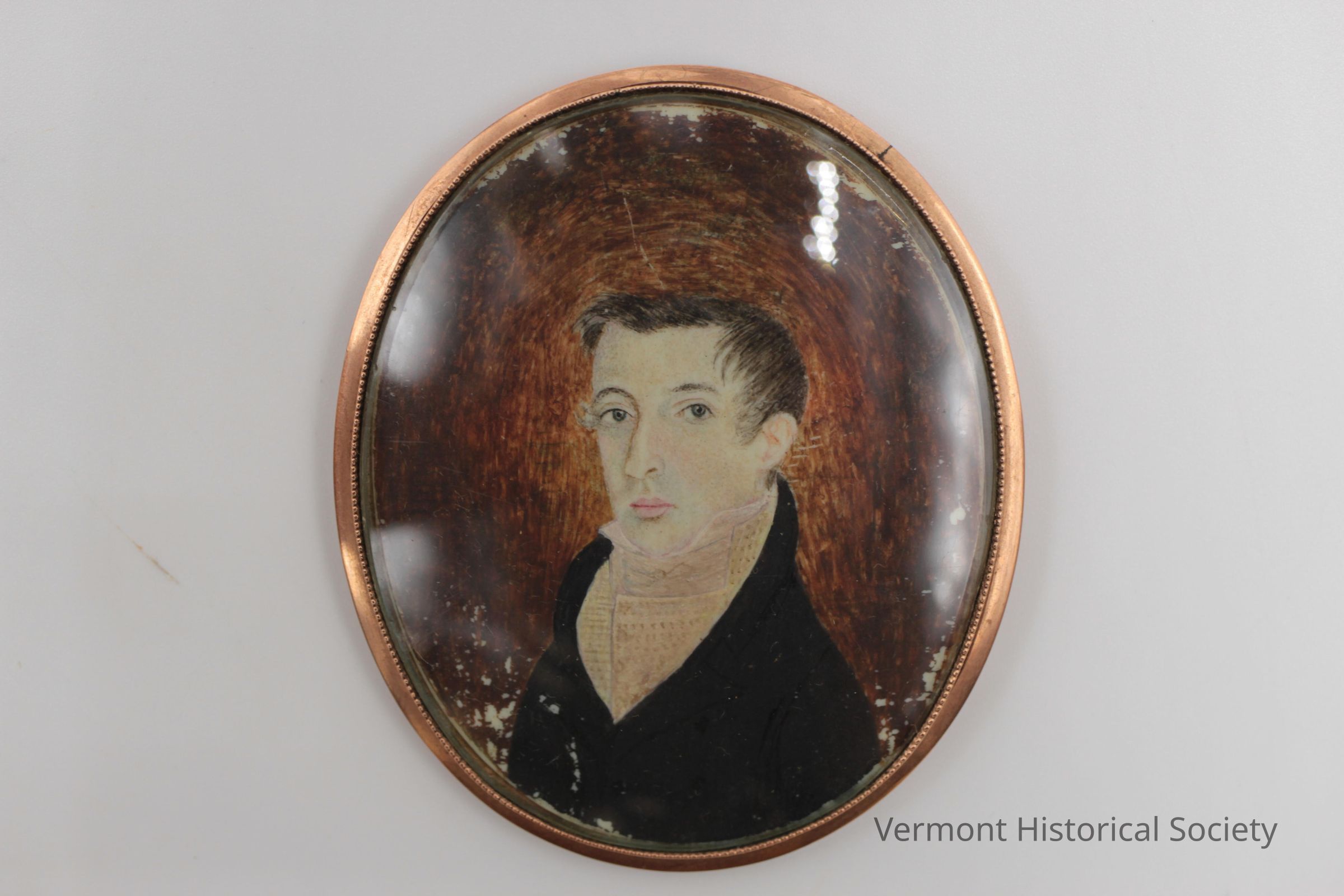 Miniature of a young man bust/shoulders. His eyes look directly at the artist; his hair parted on his left side is combed forward. The hair on the crown of his head is combed back. He has a pointed chin and a serious expression, wide set eyes. His jacket has a high collar as does his white (yellowed) shirt. The background is painted in circular motions around the outside in browns and lighter browns nearer the head. Engraving on back: "Royall Tyler Jr. / obt. Nov. 7th 1813 ae 19" The miniature is behind domed glass. The pin back is brokenType of Painting