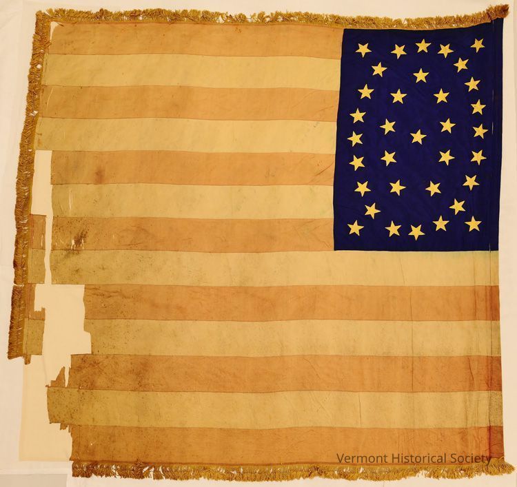 2nd Vermont Infantry Regiment national flag. Attached to staff by sleeve. Canton style is rectangular, and is 24.5 in by 37 in. There are 34 gold painted stars arranged in a double ellipse. The stripes are very faded and measure 5.25 in. in width. Fringe is present.