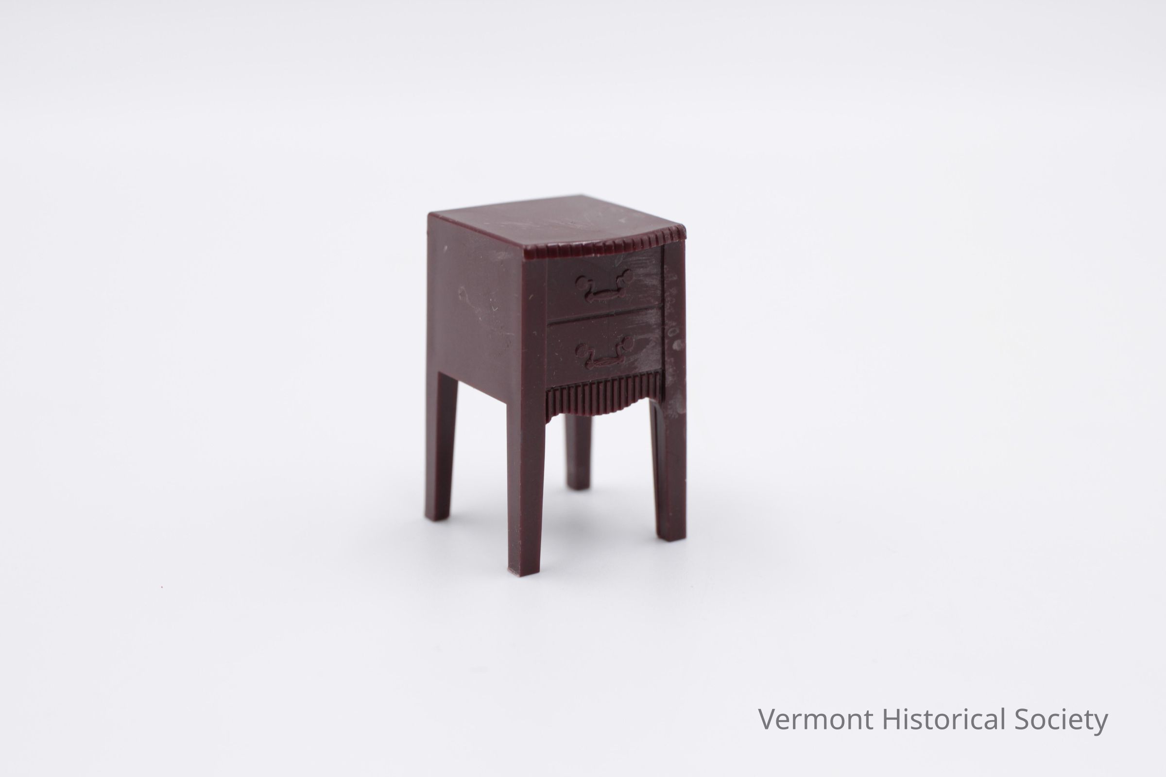 Miniature brown plastic bedside table sized for a dollhouse. The front of the table is molded with two drawer fronts, each with a hanging pull. The front of the tabletop is slightly rounded.Context