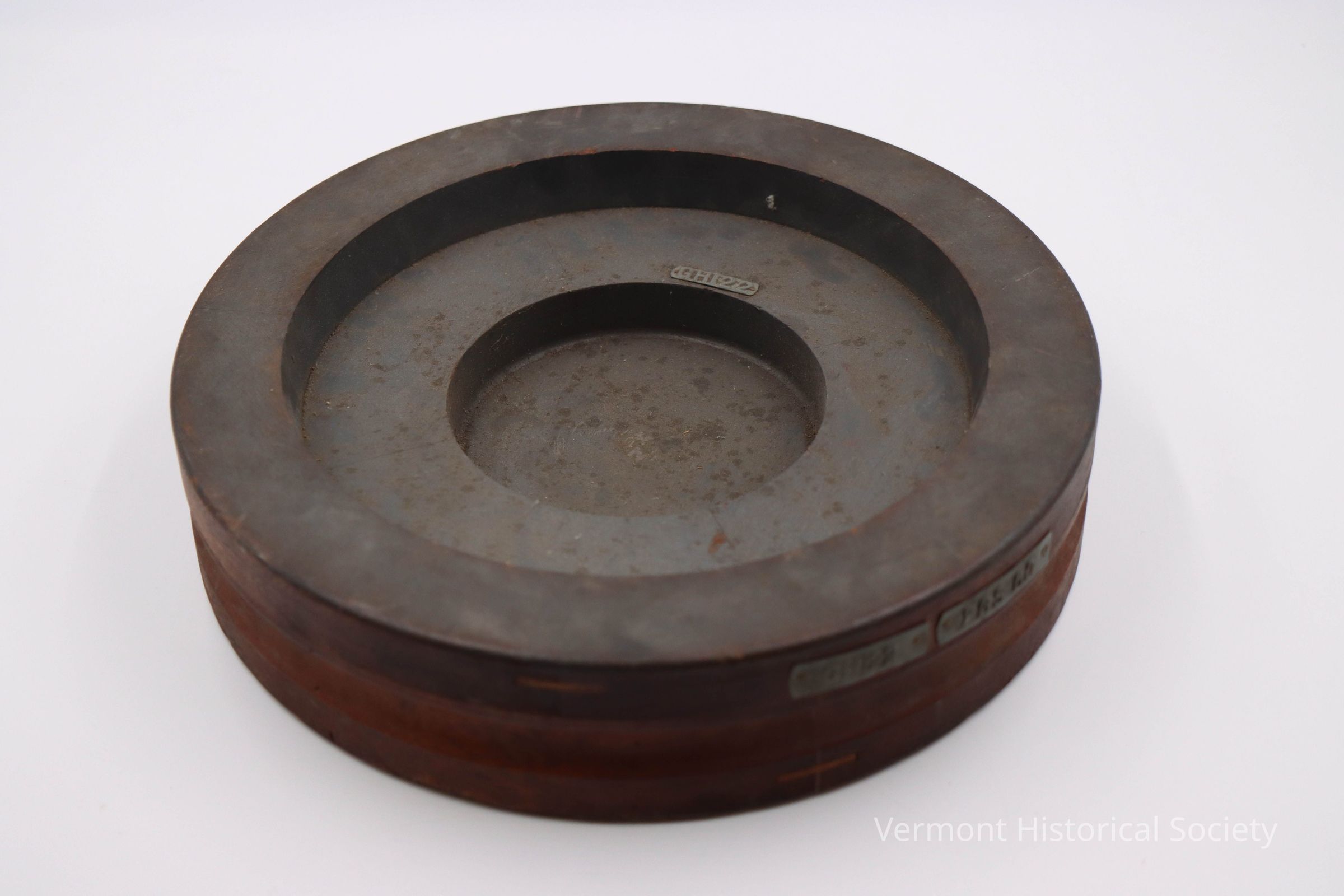 Round wooden flywheel. The wheel is formed from concentric circles, with the center being more inset than the outer circles. There are three stamped metal ID plates with product numbers stamped into them.