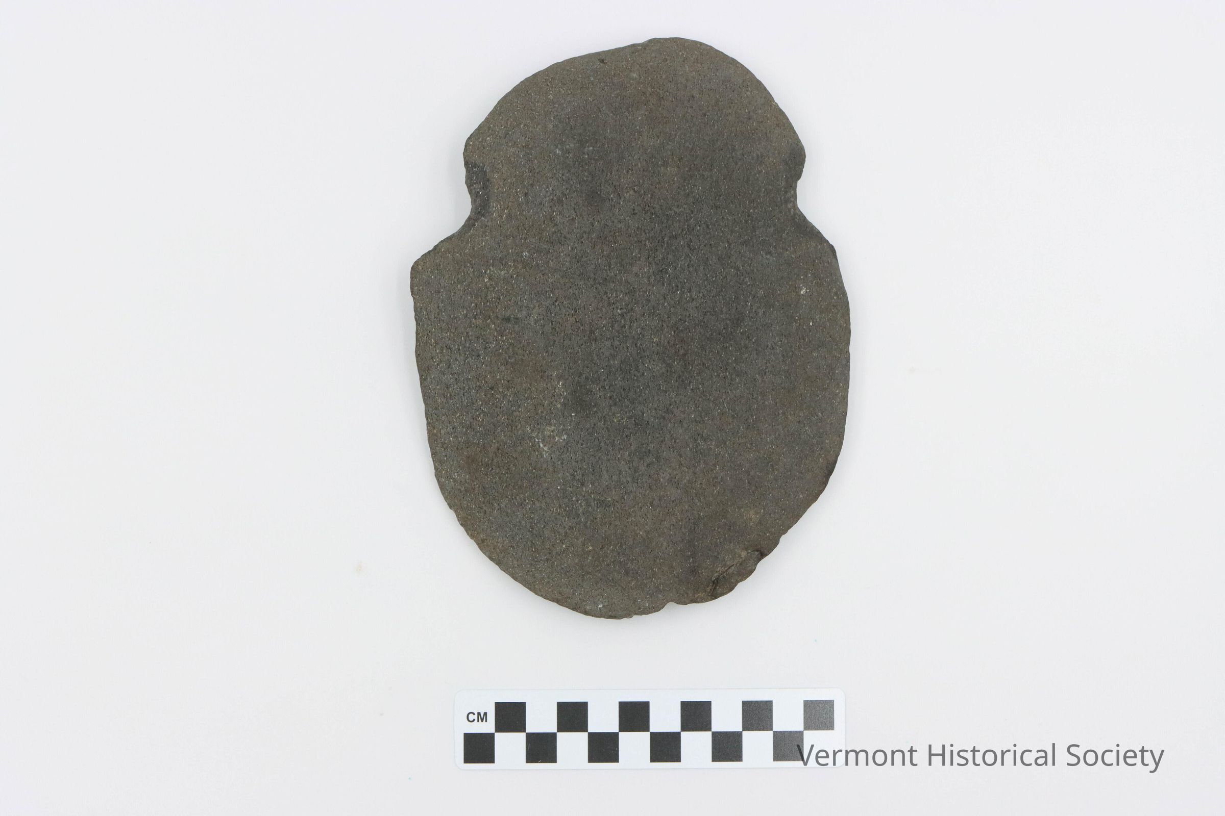 Ground stone hoe or spade. The surface is completely ground. The butt end is rounded, and there are side notches near the butt end. The blade end is sharp with chips removed from use.