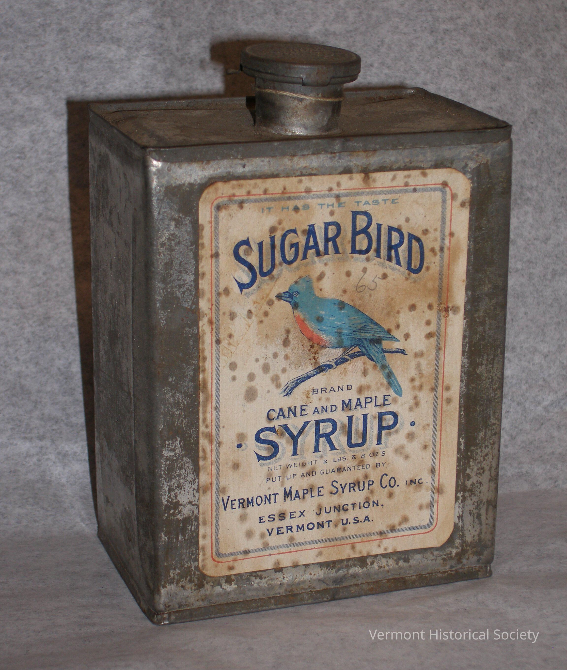 Metal maple syrup can. The can is rectangular with a round opening and lid protruding from the top. There is a tan label on the front with a border of a thin red line and thicker blue line, and that reads "IT HAS THE TASTE / SUGAR BIRD / BRAND / CANE AND MAPLE / SYRUP / NET WEIGHT 2 LBS & 8 OZ / PUT UP AND GUARANTEED BY / VERMONT MAPLE SYRUP CO. INC. / ESSEX JUNCTION, VERMONT U.S.A." in blue text. In the middle of the label is a illustration of a blue bird with a red breast, standing on a branch.
