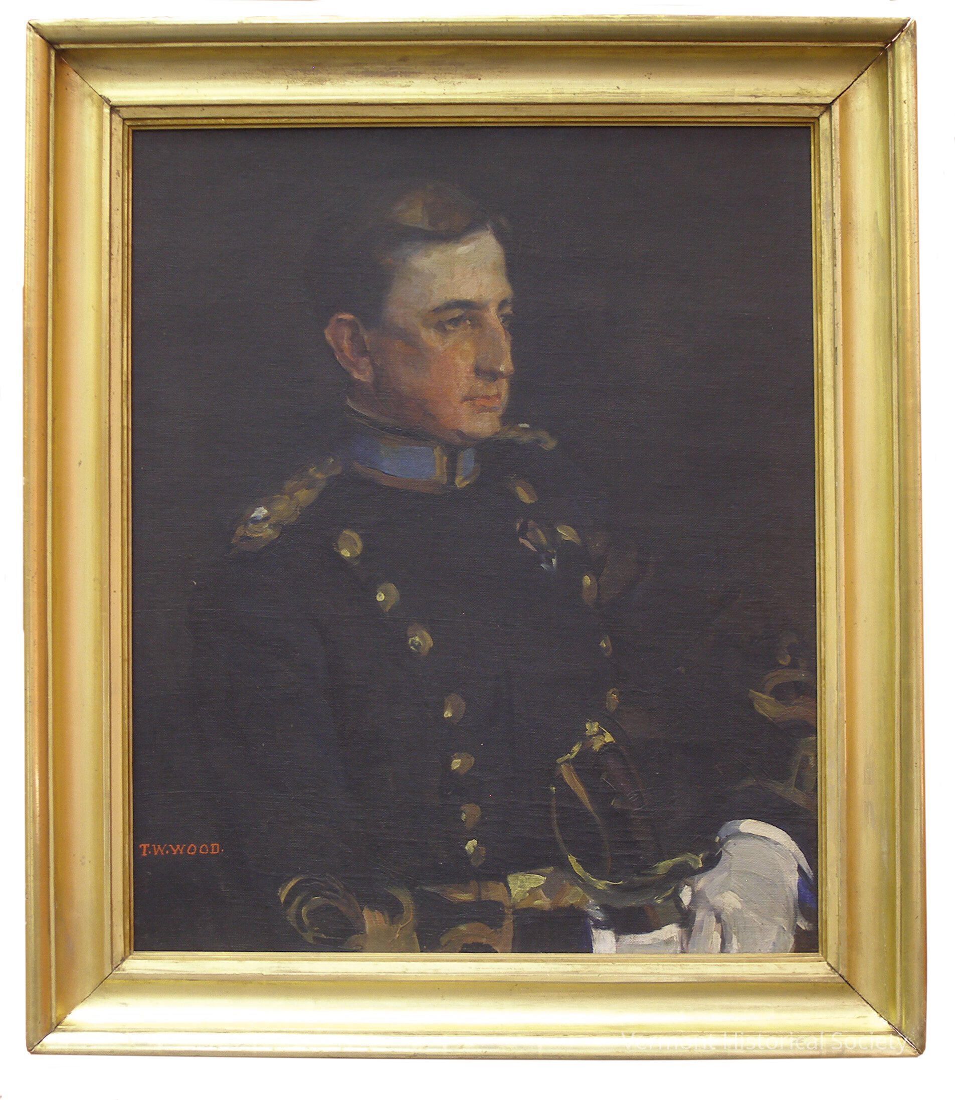 Portrait showing a naval officer wearing a double-breasted uniform coat. The coat has a standing collar decorated in light blue edged with gold. He is wearing gold, braided epaulets. Addition gold braid decorates his sleeves. He is wearing white gloves and holding a sword in both of his hands. The piece is prominently signed in lower left in red: "T. W. Wood."Type of Painting