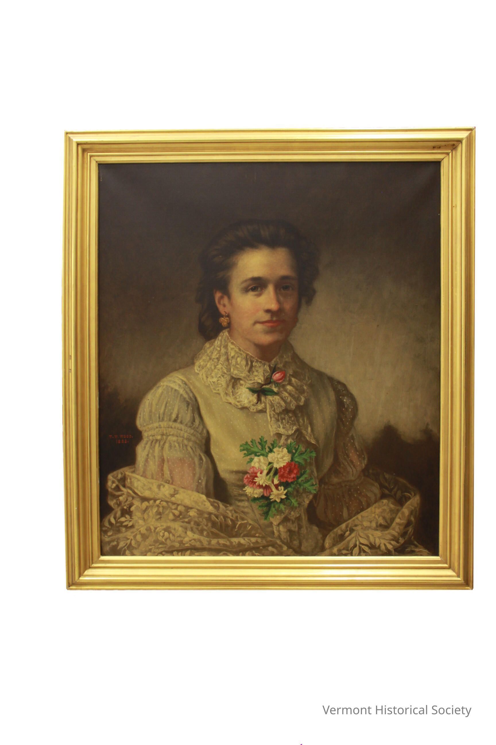 Ella Luthera Dewey Pitkin (1850-1879) was the second daughter of Charles and Betsy Tarbox Dewey and granddaughter of Julius Dewey. She married Carrol Pitkin in 1873 but died young in 1879. This portrait is one of two commissioned by the family from Thomas Waterman Wood after her death.