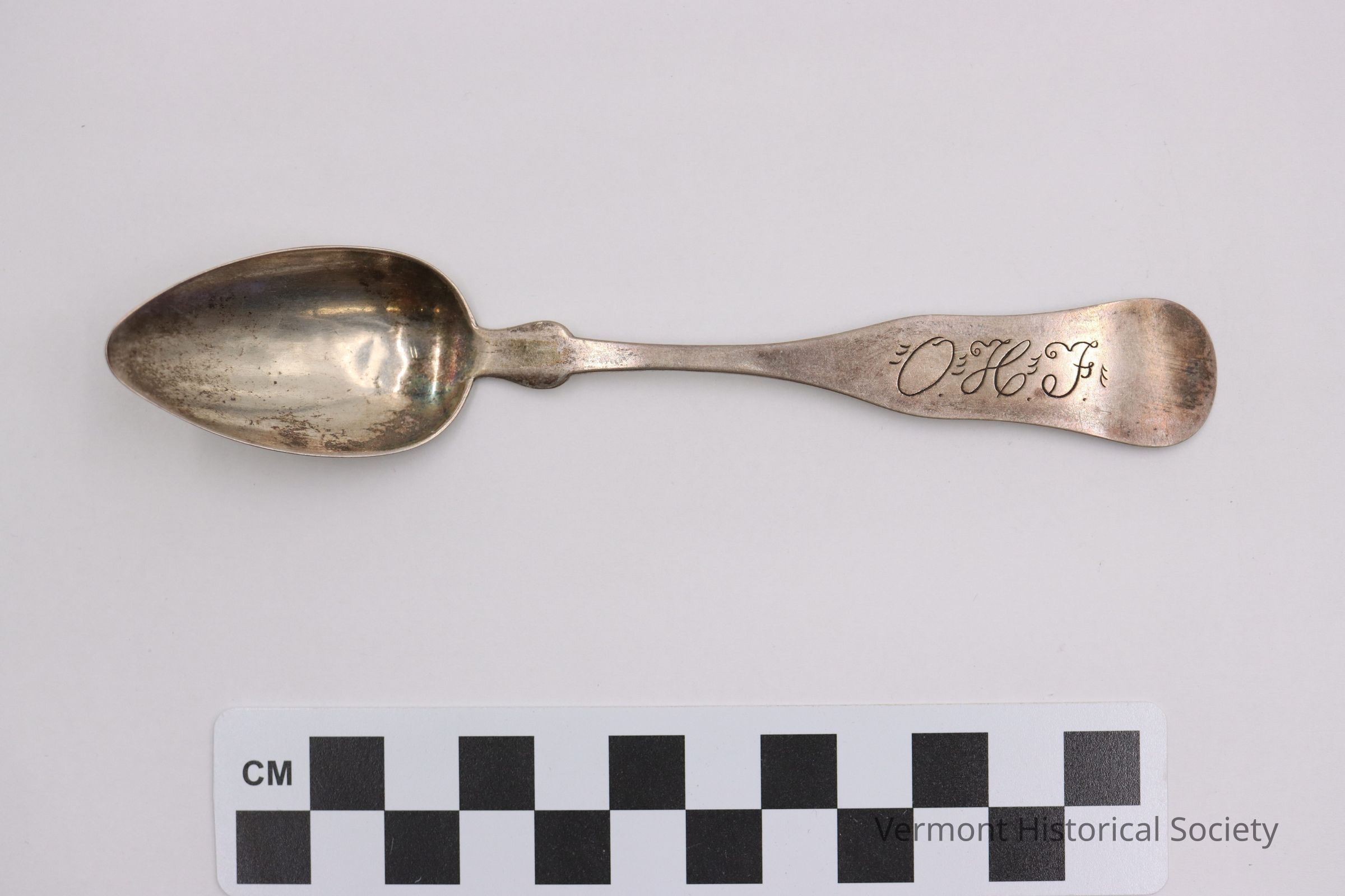1 of a set of 7 silver teaspoons. The handle is engraved with the initials "O.H.F." The reverse is marked with the name "H. M. NICHOLS." inside a scalloped-edged rectangle.