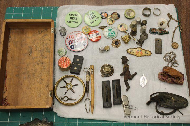 A "junk box" or "time capsule" consisting of a wooden tool box lid filled with miscellaneous objects. The lid has two hinges (partial) on one side, a latch closure (partial) on the opposite side, and a central metal handle on the top (now bottom).