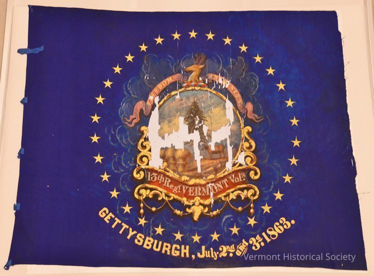 13th Vermont Infantry regimental flag, "Gettysburg." Blue background, crest in the middle