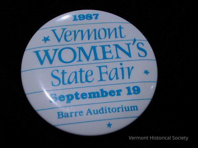 White pin with blue lettering that commemorates the "1987 Vermont Women's State Fair September 19 Barre Auditorium."Context