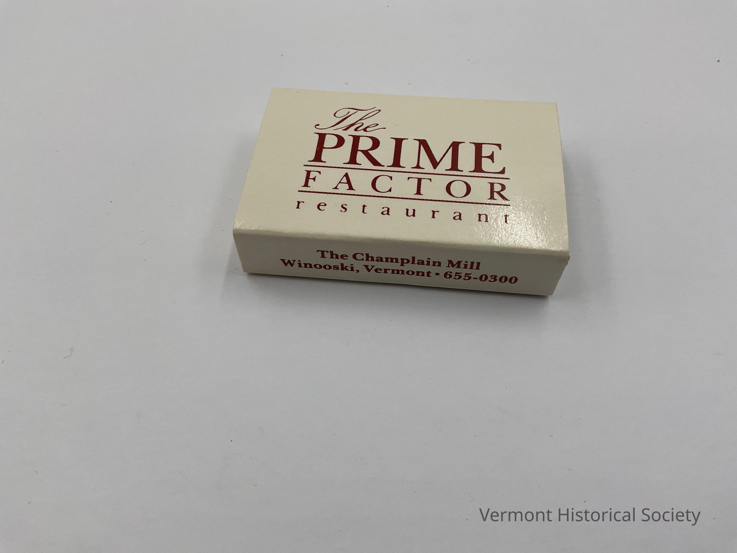 A white box of pink-tipped, wooden matches that advertises in maroon letters on the top the eatery "The Prime Factor Restaurant." On the bottom is the promotional message -- "Award winning soup & salad bar, seafood, prime rib steaks." On the side in maroon print is that address and phone: The Champlain Mill, Winooski, Vermont 655-0300. The manufacturer is listed under the strike strip -- American Ace by Universal Match, St. Louis 1-800/325-8165Context