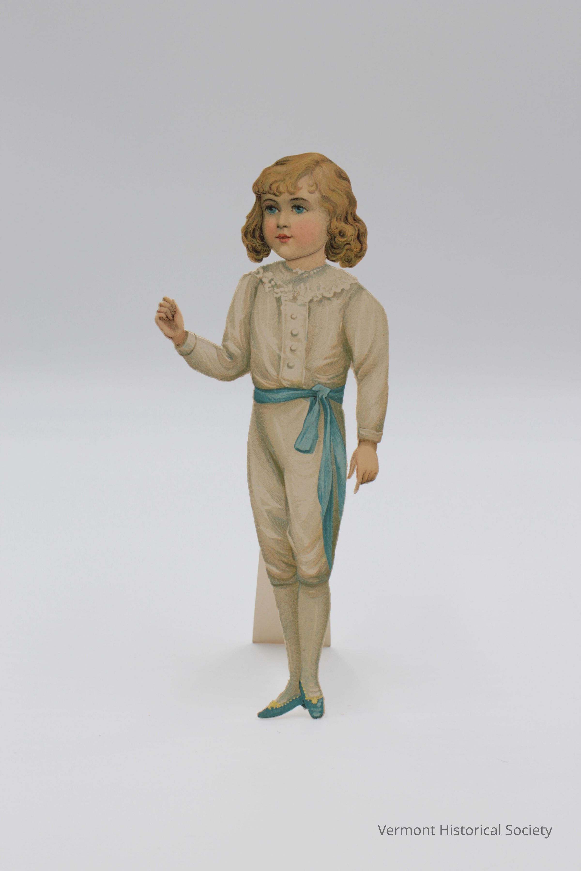 Paper doll made of cardstock showing a young boy with blond, chin-length hair. He is wearing a white long-sleeved undershirt with a ruffled collar, white knee-length pants, white stockings, and blue shoes with yellow ribbons. There is a blue ribbon tied around his waist. The head attaches on the reverse to a long neck, allowing the chin to hang over clothing. There is a rectangular cardstock tab on the reverse that allows the doll to be propped standing up. The tab has the penciled inscription, "George Davenport". The back is printed with trademark and copyright information.Context