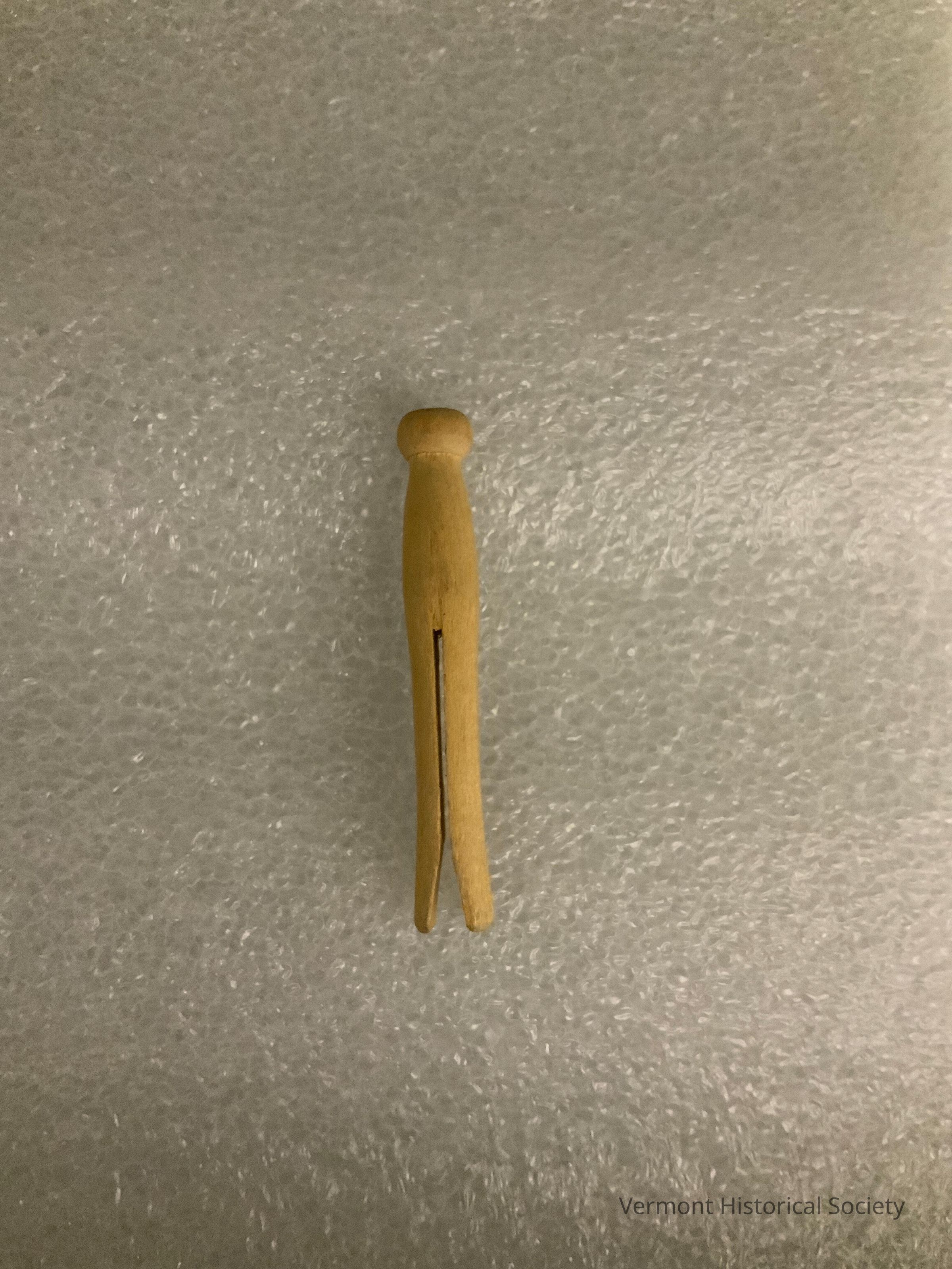 Miniature wooden clothespin. The pin is static, without a spring. It is sized for a doll.Context