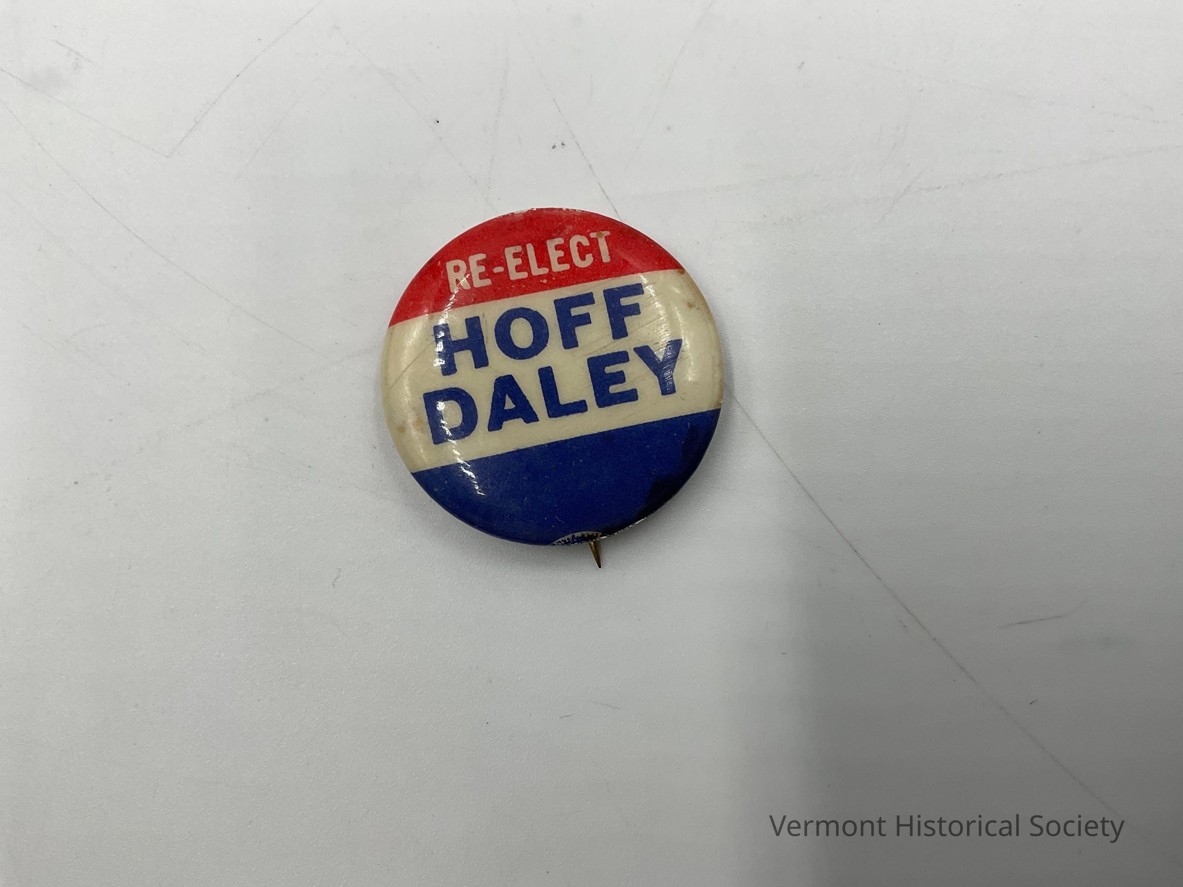 Round, metal button. The top third of the button is red with "RE-ELECT" printed in white lettering. The middle third is white with "HOFF / DALEY" printed in navy blue. The bottom third is navy blue without any lettering.
