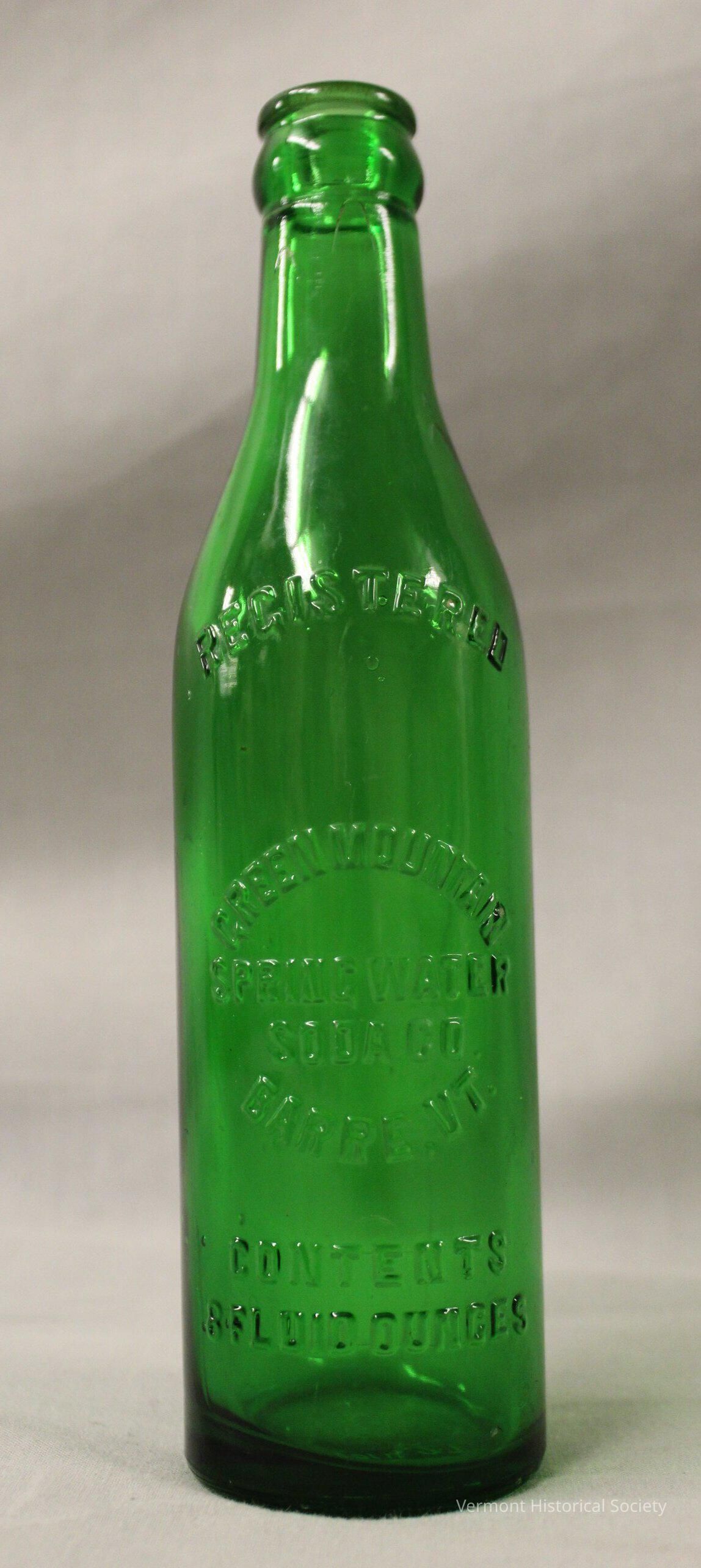 Round green glass bottle with the molded inscription, "GREEN MOUNTAIN SPRING WATER SODA CO. BARRE, VT." in a circle at the center. The word "REGISTERED" is at the shoulder, and the words, "CONTENTS 8 FLUID OUNCES" is near the base.Context