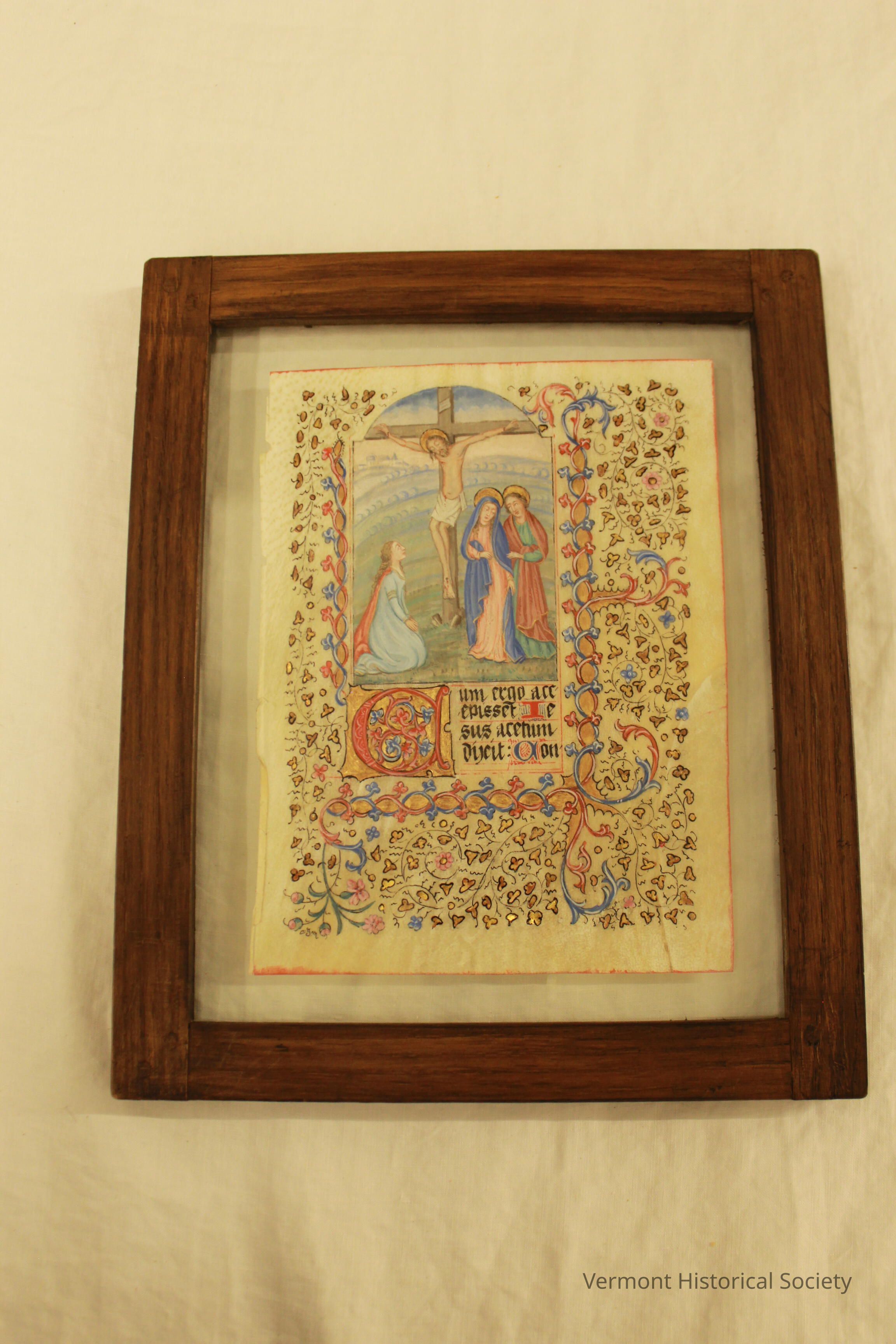 Framed page depicting the crucifixion from a 15th century book of hours. Page in between glass in a wooden frame.Context