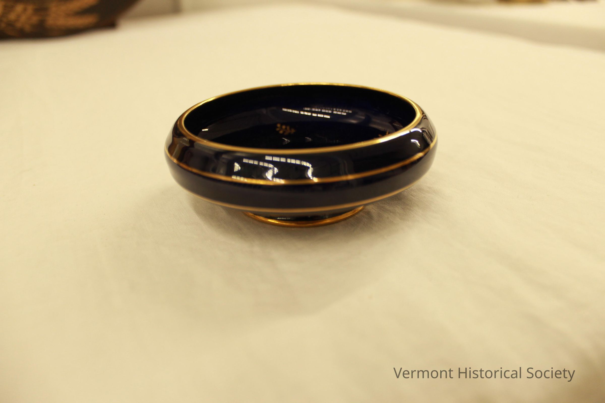 Small Sevres porcelain dish. The dish has a dark blue glaze with gilt floral sprays inside the dish and two gilt bands around the outside. The dish rests on a shallow round pedestal base.