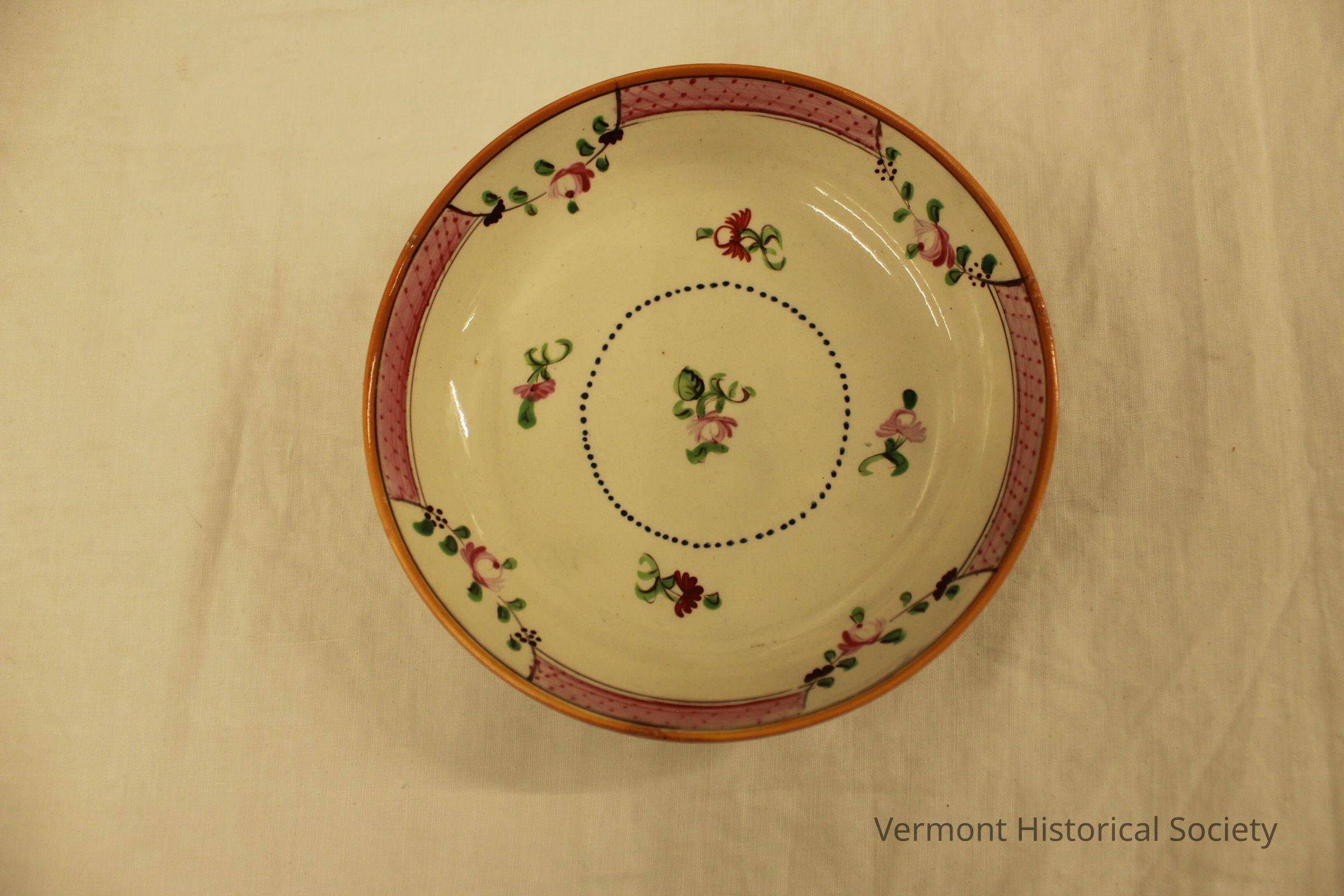 Cream-colored dish with orange and red stripes on the rim, pink and red flowers and green leaves. No lable, perhaps hand-painted.
