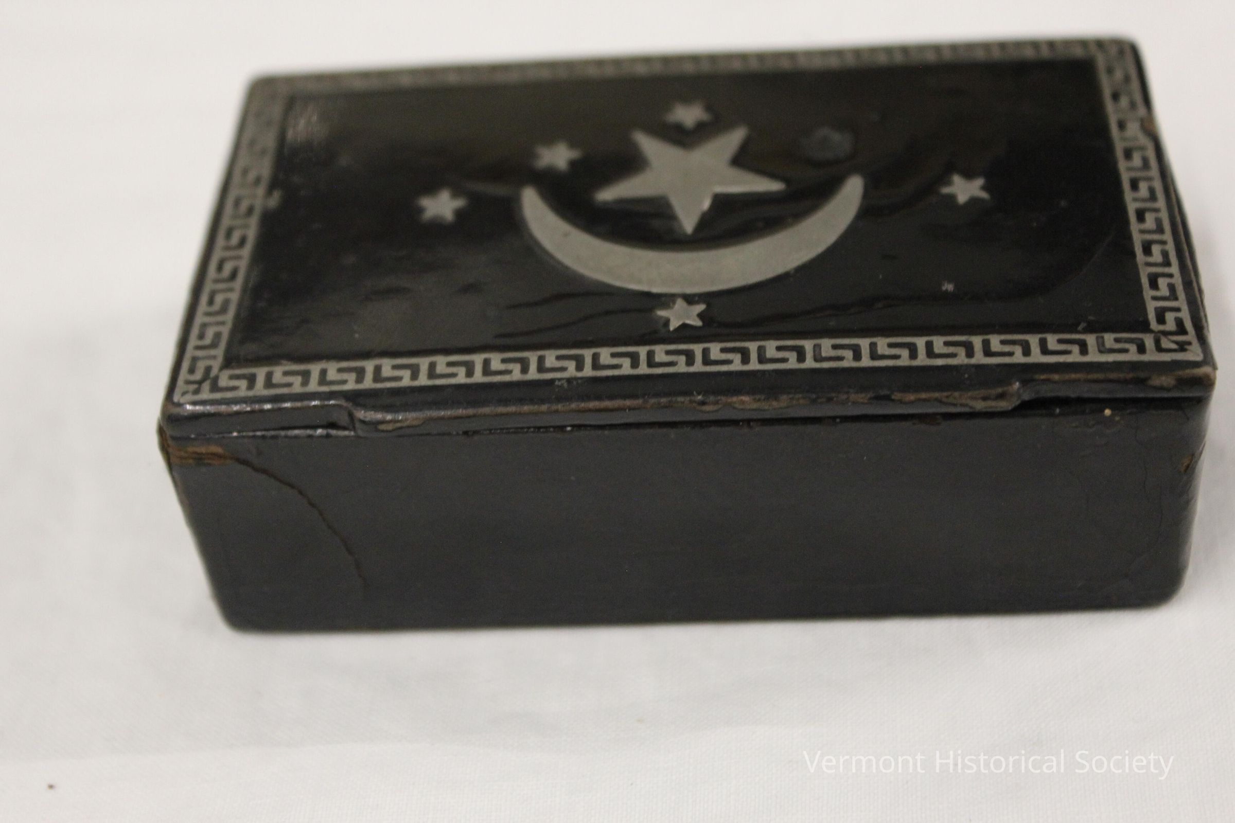 Small, black lacquered box with a silver moon and stars and a silver border on the lid.