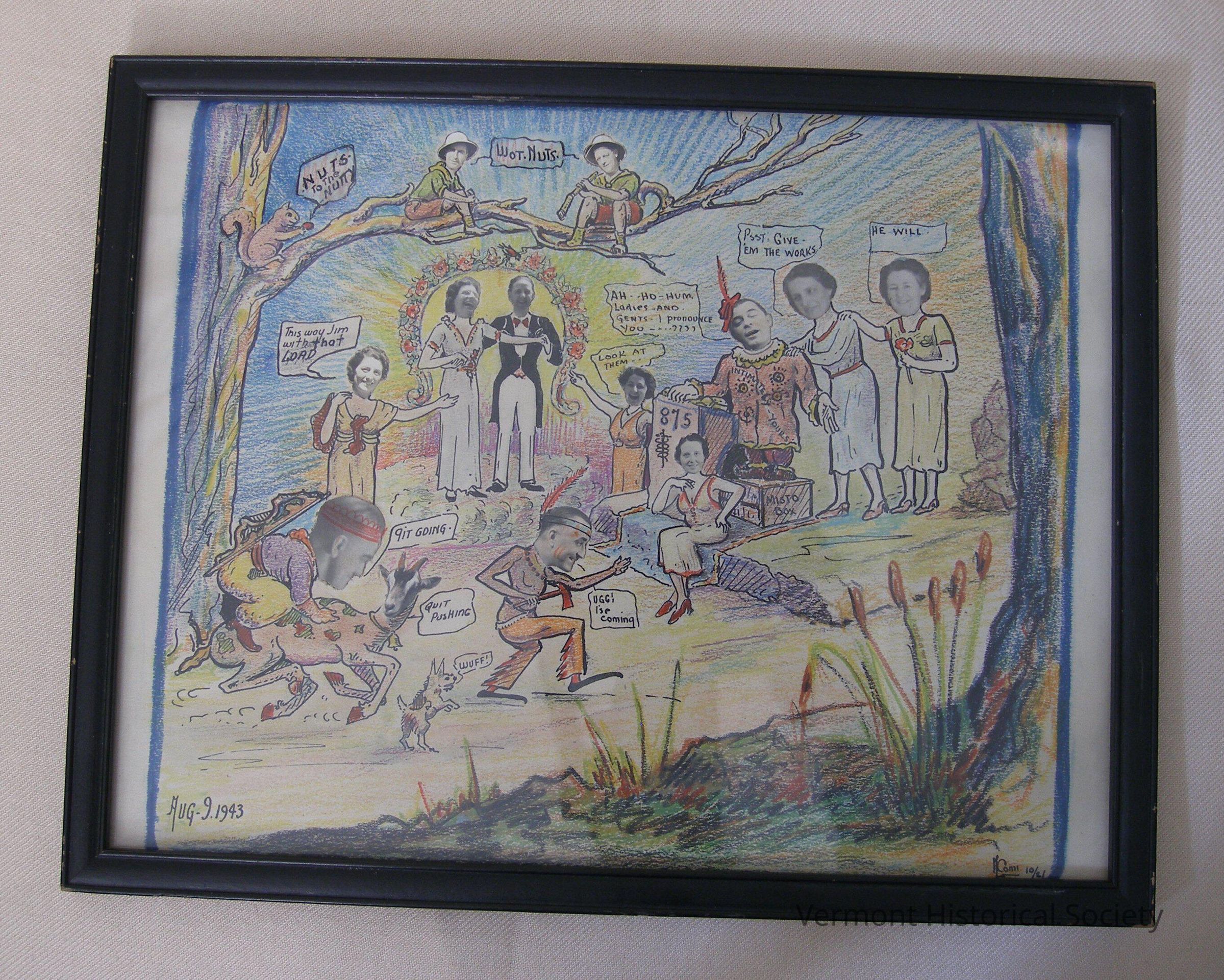 Cartoon made with either colored pencil or crayon and ink. It shows an outdoor scene that centers around a bride and groom. Around them is a arch or garland of flowers with yellow, green, and blue rays in the sky behind them. A tree branch hangs over them with 2 men on it as well as a squirrel. A tree trunk creates the left side border. Gathering around the couple are 6 people with 2 men in the foreground, 1 (on a goat) chasing the other. Most of the people have word bubbles projecting from their mouths. The head of each individual is a photograph with the rest of their body a cartoon. To the right is a second tree trunk with cat tails at the base.Type of Drawing