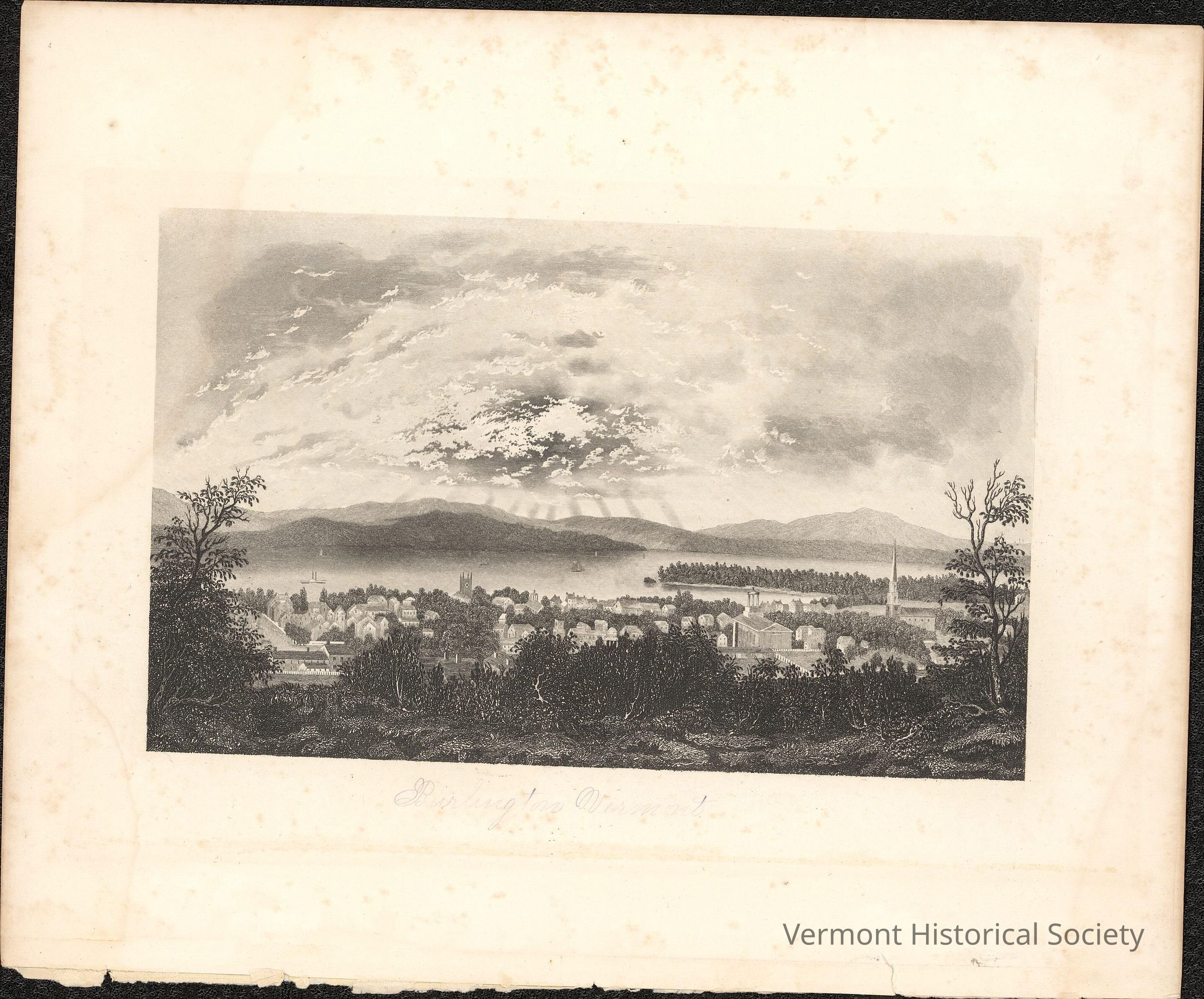 Landscape print removed from a book showing a slight bird's-eye view of a city [Burlington, Vermont] on the edge of a body of water [Lake Champlain]. The city has several clusters of buildings separated by low trees. While many of the buildings on nondescript, there are 4 buildings with steeples or cupolas: 2 with pillared steeples, 1 with single-point steeple, and 1 with 4 corner points. The body of water spans across the center of the composition with mountains along the far side. There are 6 crafts on the lake: 1 steamboat, 3 single-masted sailing boats, and 2 unidentifiable boats. A cloudy sky takes up the upper half of the composition, with rays of sunlight shining from the center onto the far mountains. The bottom of the composition is bordered by close foliage, giving the impression that the viewer is standing on a bluff. The words, "Burlington Vermont." are written in pencil at the center bottom.Artwork Details