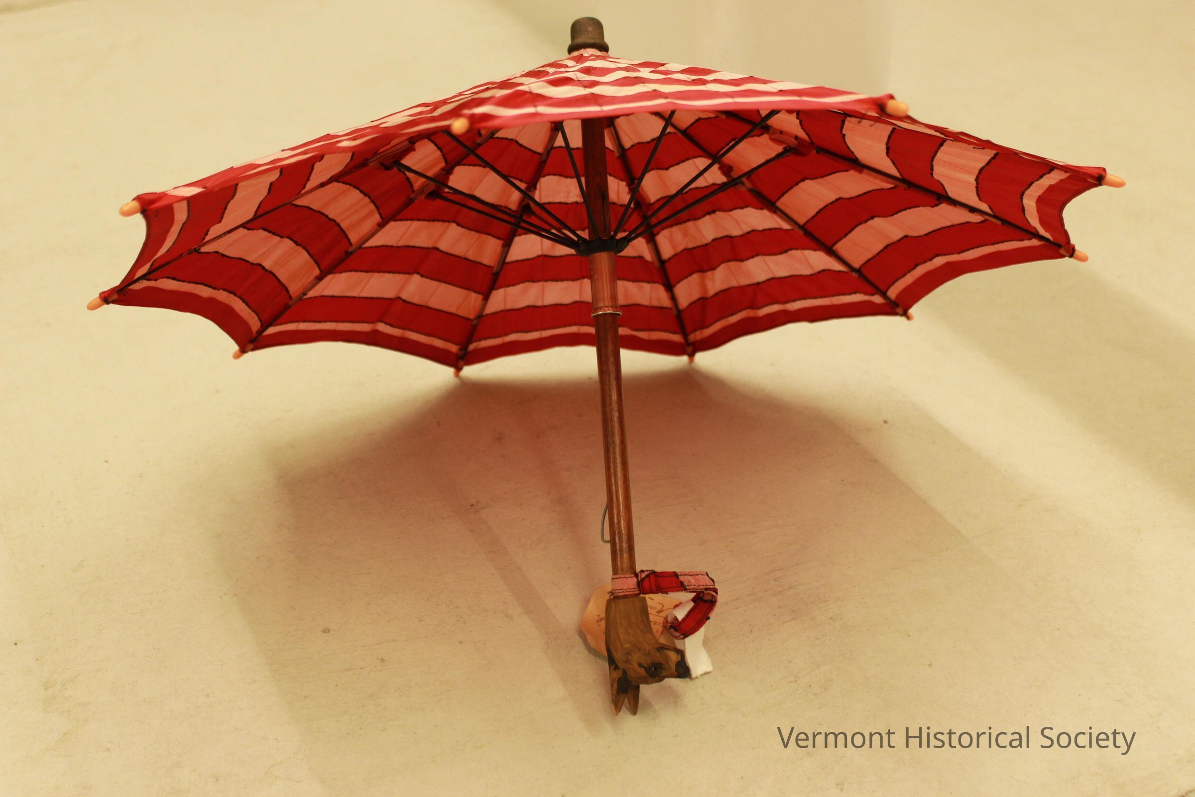 Red and pink striped umbrella with a carved wooden handle in the shape of a dog's head. Tag indicated the umbrella is from 11-year-old Michele Renault for an young American friend.