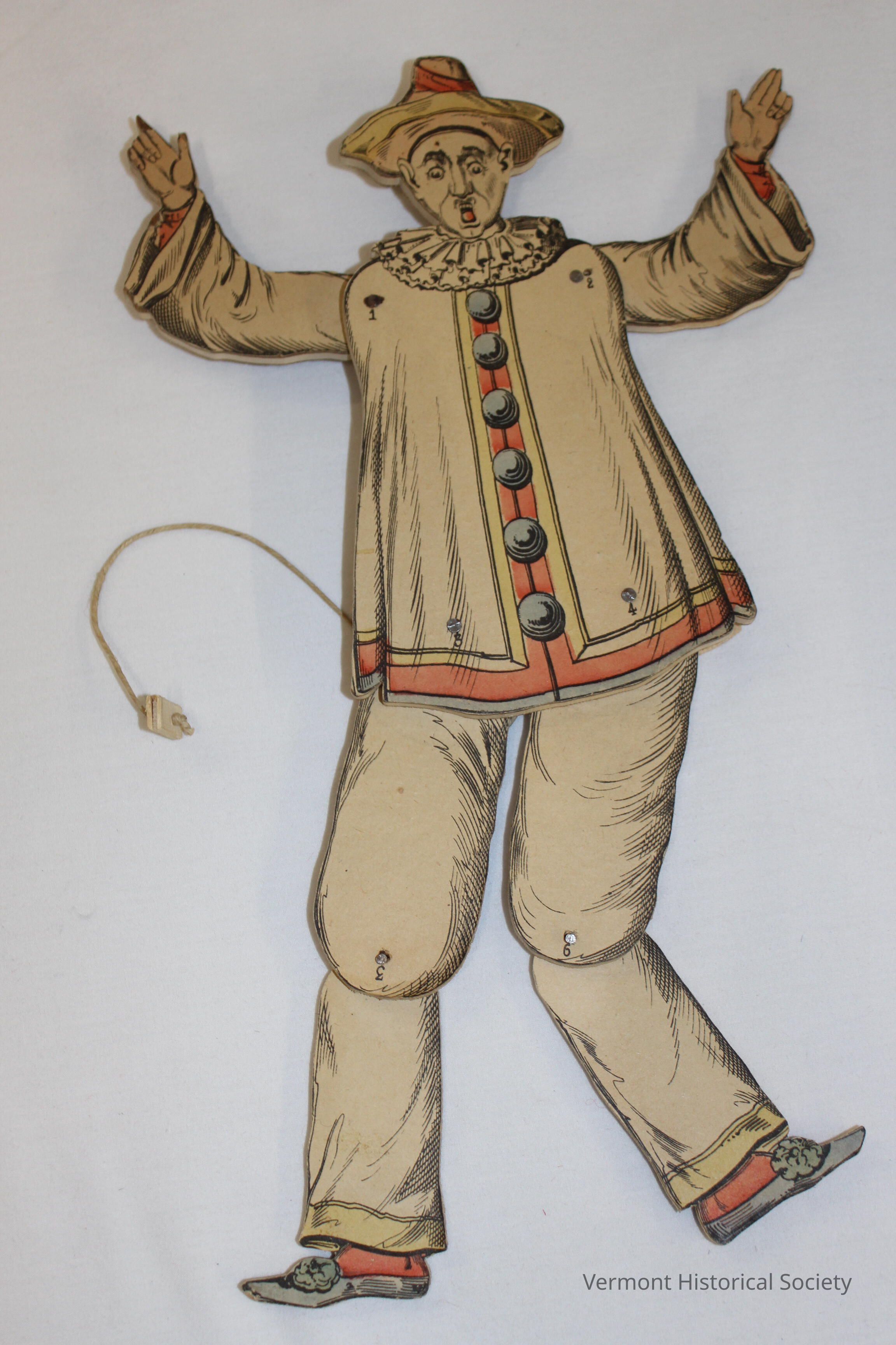 Wooden marionette of a man with an astonished expression, loose clothing and big buttons on the jacket. It is out a quarter of an inch thick. This and five other marionettes are from "La Maison St. Joseph Hospice De Viellards."Context